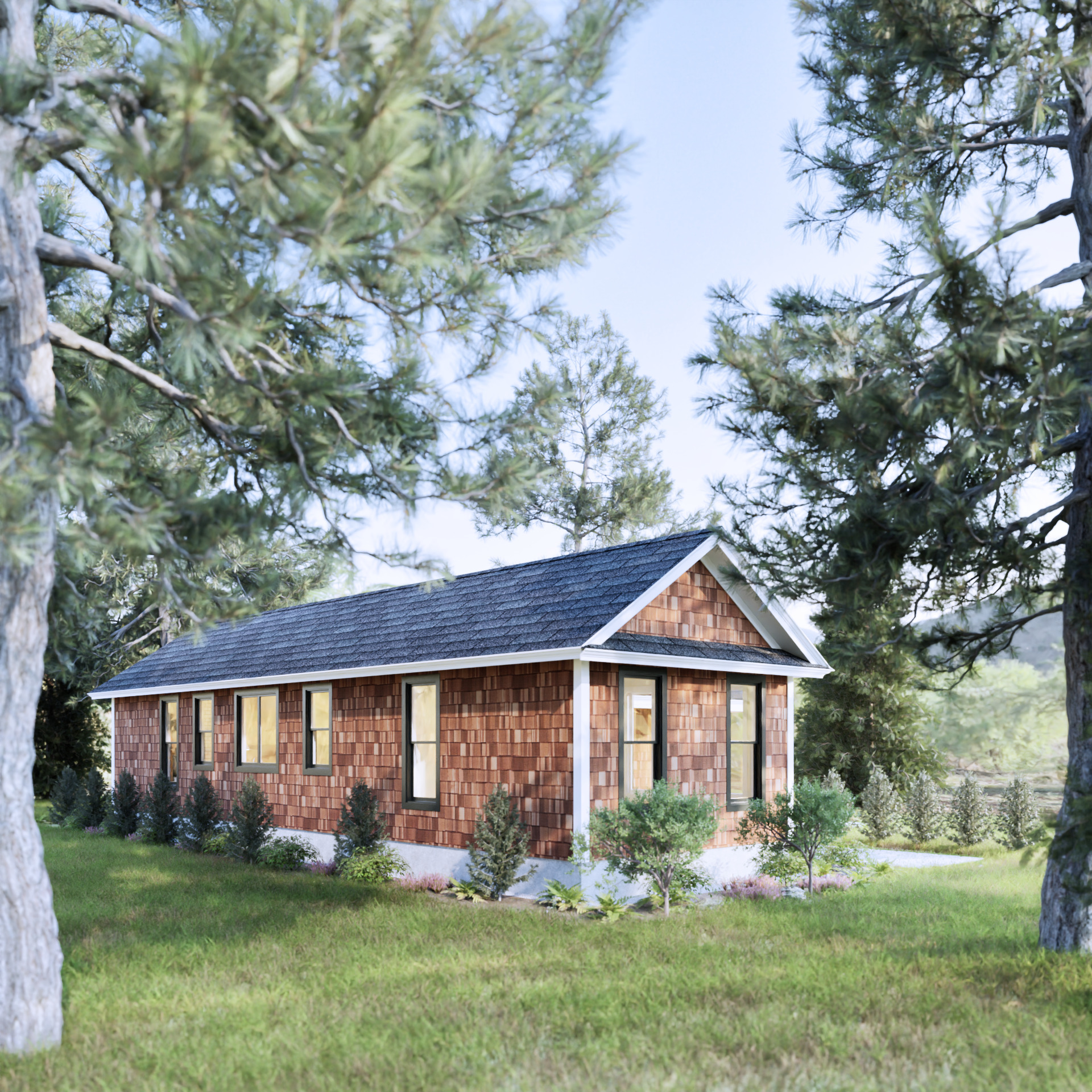 the house is surrounded by a lot of trees bushes and flowers in the garden