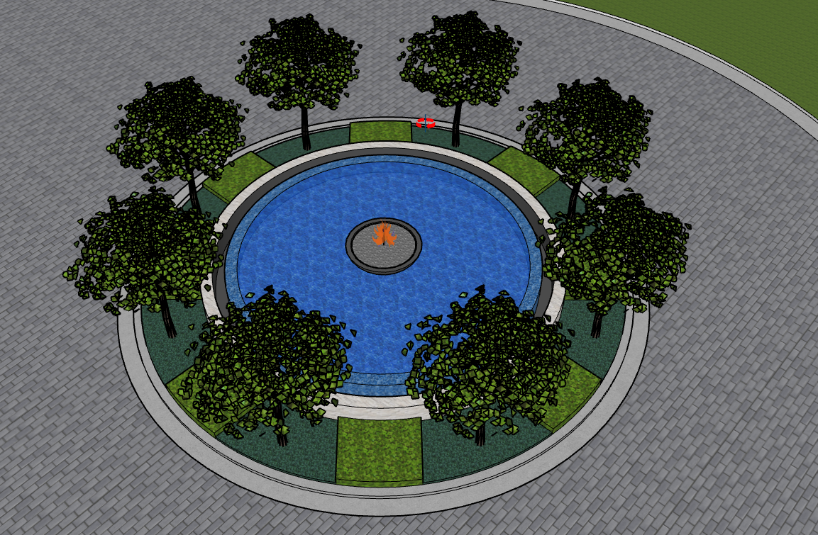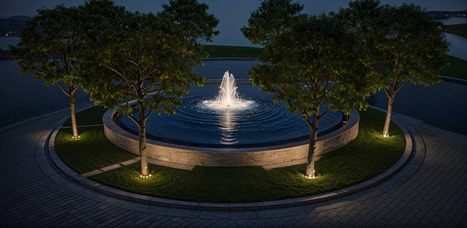 add lights to the trees add lights to the fountain pool make the plants in between the trees a different color