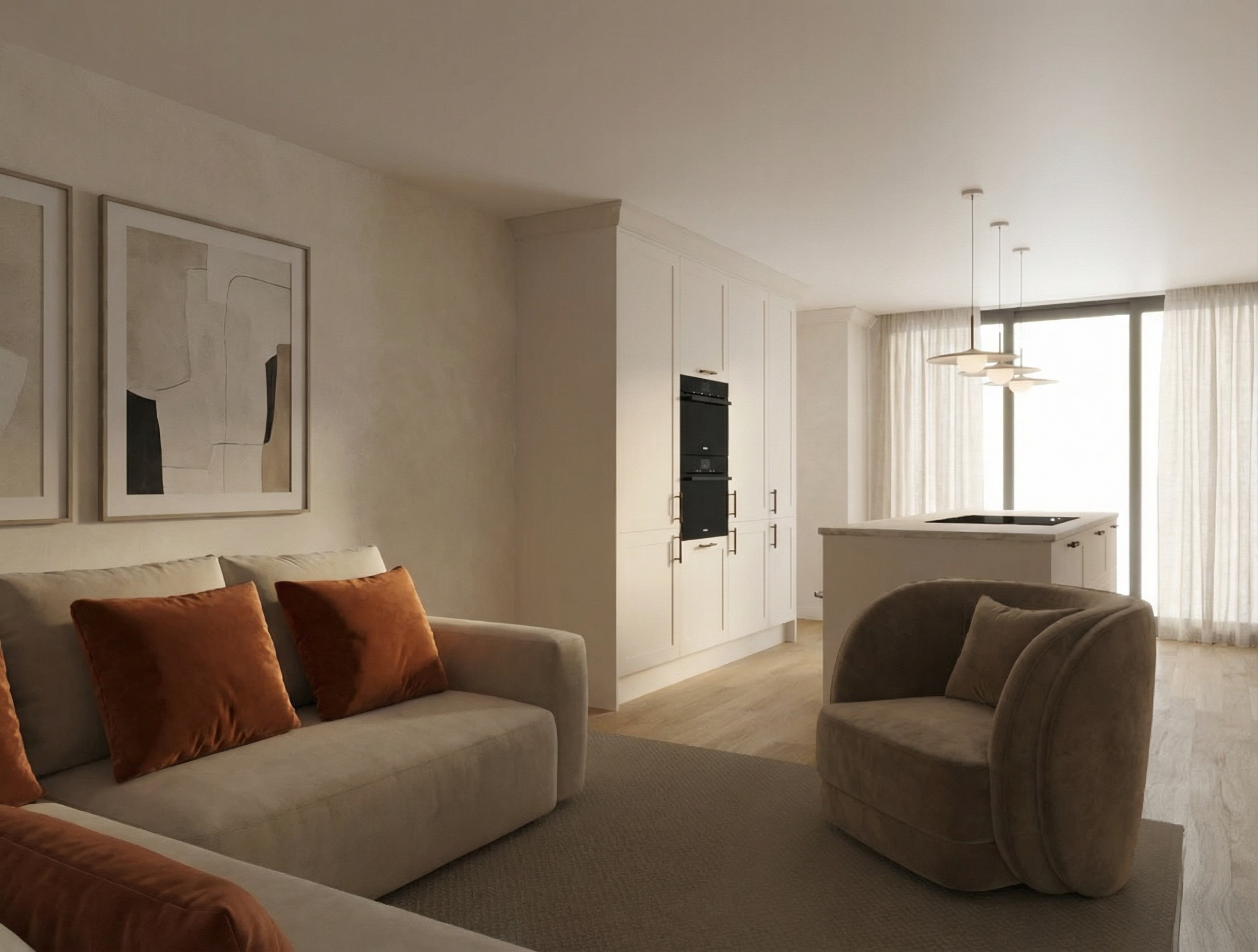 realistic image luxurious bathroom white paneled cabinetry matching mirrors and sconce lights at each vanity small glass pendant light over tub fill tub with water and drape a towel on the edge small glass mosaic tile on back wall behind tub to ceiling glass shower wall on left with small glass mosaic tile on walls fluffy white oval rug in middle of floor
