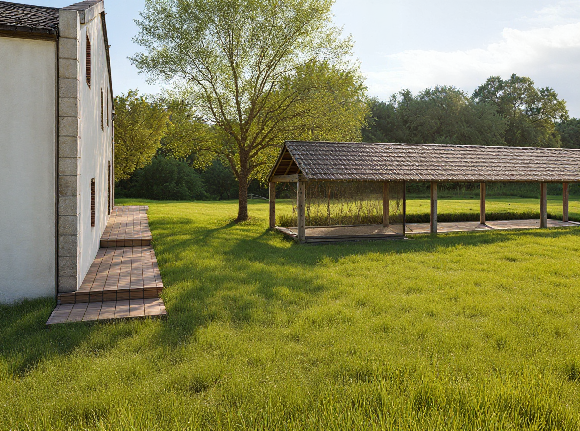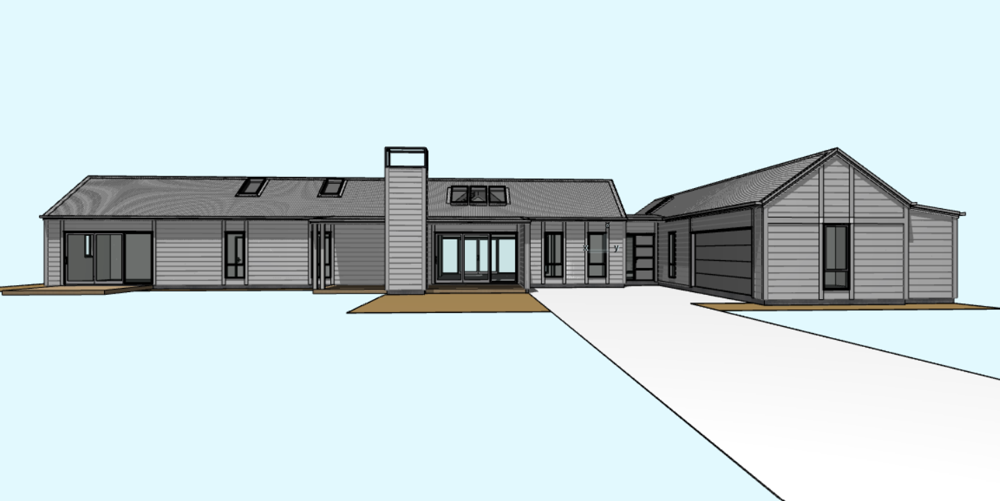 black metal roof black window frames white horizontal weatherboards concrete driveway lawns low timber decks extensive native planting background trees sunset interior lights on