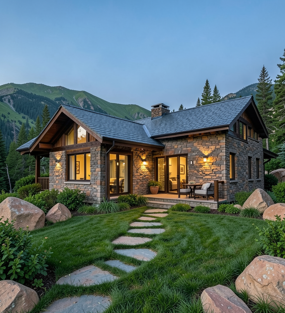 render a modern house exterior with large windows incorporating a cream white fa ade for the building frame the windows with sleek dark metallic borders inside the windows create a cozy stylish interior featuring warm beige and soft gray tones use natural wooden flooring and add subtle lighting for a welcoming ambiance capture the soft golden glow of a late afternoon sun casting gentle shadows and highlighting the architectural details for a serene peaceful atmosphere