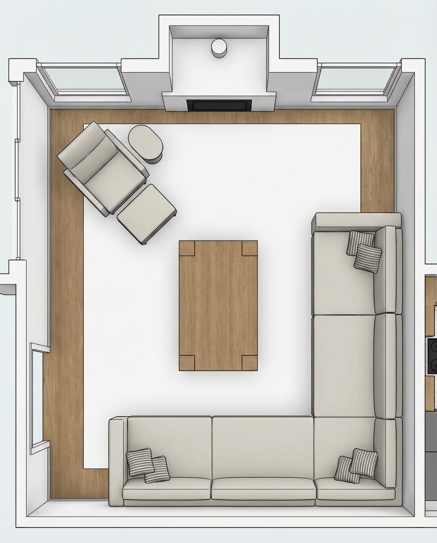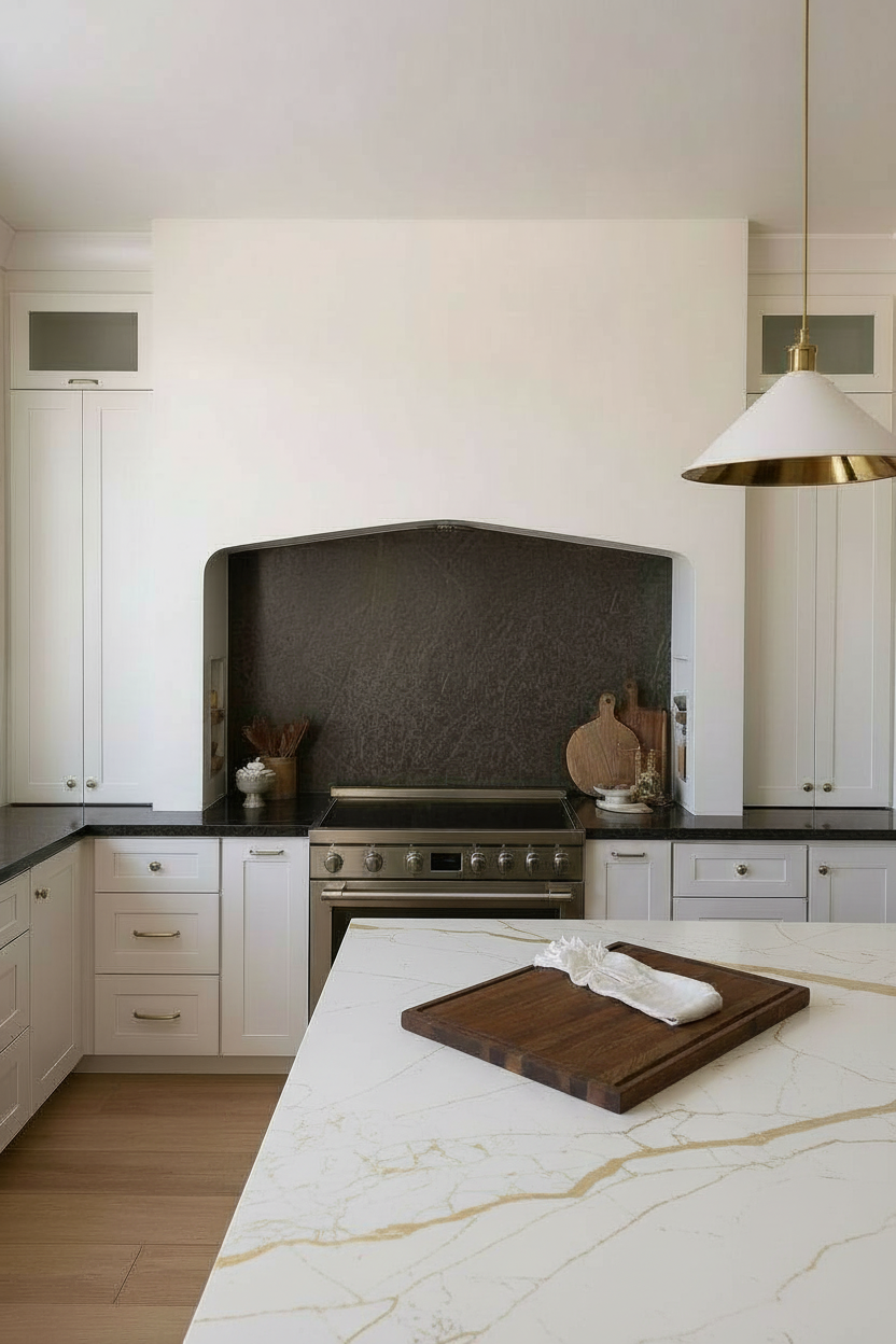 organic modern house with a minimalist design featuring a stone siding and stucco with black shingles the windows are large with clear glass and white frames the atmosphere is bright and serene with a soft blue sky overhead surround the house with lush green lawn and a few tall elegant trees add subtle shadows and highlights to give depth and enhance the architectural features the setting is calm and inviting reflecting a peaceful acreage environment
