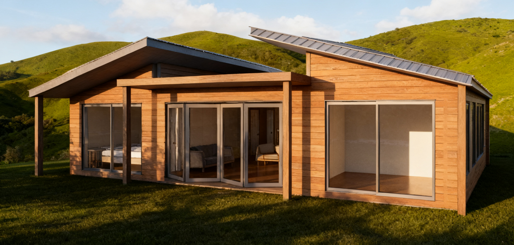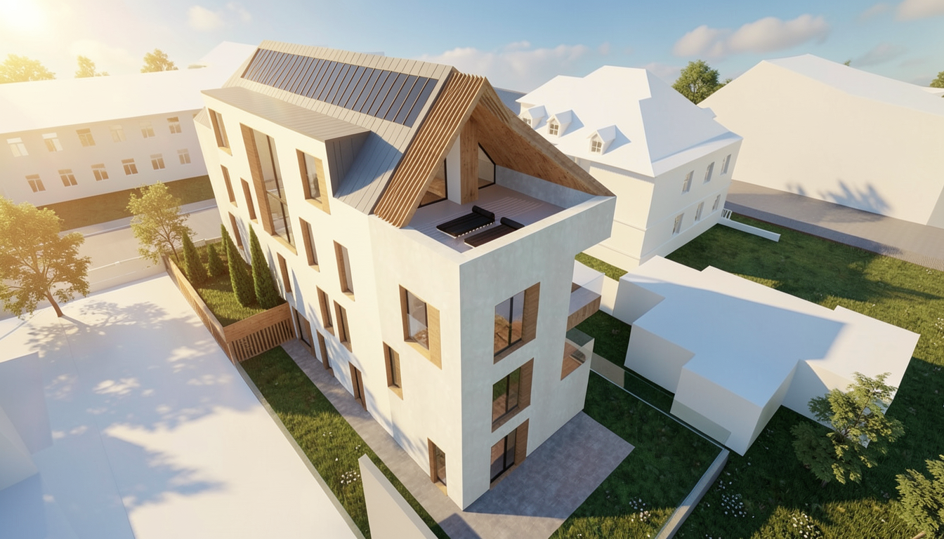 keep the exact same geometry scene content object positions materials textures and camera framing as the original render apply only atmosphere lighting mood and color grading set the scene right before blue hour sky with thin soft clouds and a cool to warm gradient steel blue overhead transitioning to warm sunset tones near the horizon use cinematic soft lighting with moderate contrast gentle shadows cool ambient fill and warm interior window glow inviting realistic wet ground with realistic reflections on asphalt paving subtle specular highlights very subtle bloom around light sources crisp but natural detail plus a very light atmospheric haze for depth color grade teal shadows cool midtones warm highlights teal in shadows and midtones warm highlights controlled saturation clean neutrals no oversaturation photorealistic architectural marketing render look balanced exposure slightly cool white balance