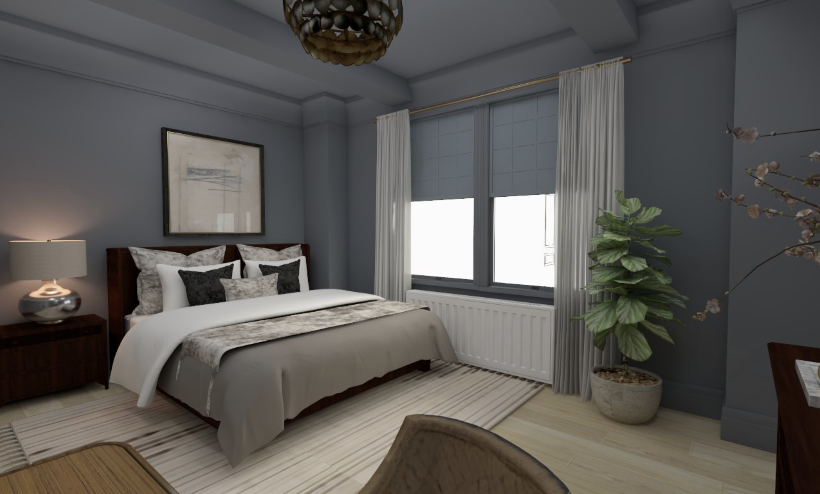 the paint is darker the ceiling is painted the view outside is another apartment building the paint color is benjamin moore 2120 40 add honeycomb window shades same color as the wall make the shades the same color as the walls the shades are not translucent make the shades darker undo last command