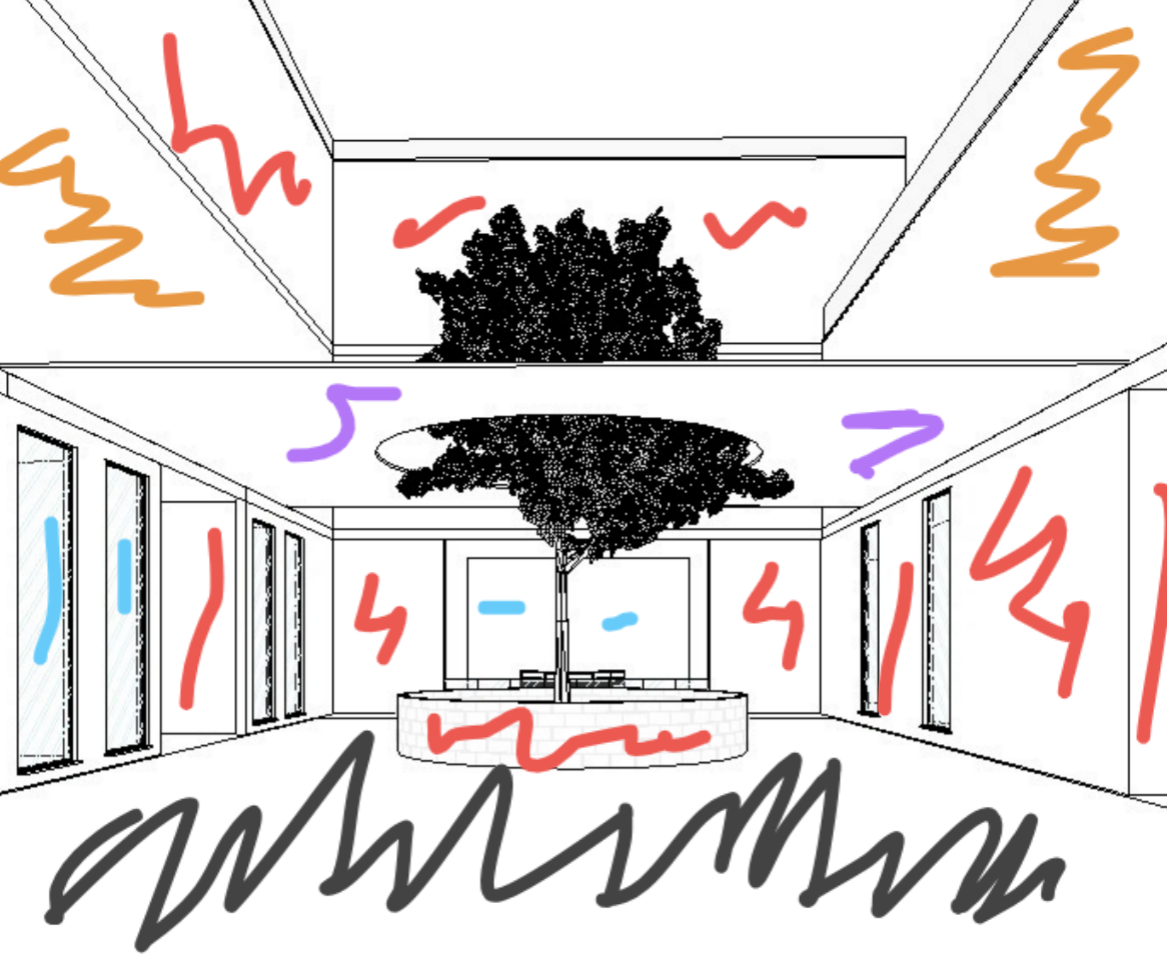 orange elements wpc exterior cladding horizontal wood plastic composite panels warm wood tone matte finish clean modern installation red elements exposed brick walls red beige tones textured masonry slightly irregular natural color variation visible joints blue elements floor to ceiling glass windows transparent double glazed glass subtle reflections aluminum frames in satin copper tone purple elements polished concrete structure smooth exposed concrete beams and slab edges light gray tone slightly reflective gray elements asphalt pavement drop off street realistic asphalt texture slightly worn matte finish subtle tire marks