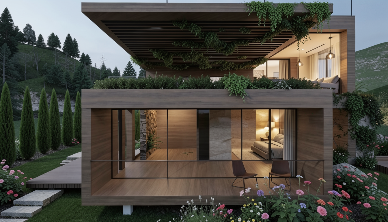 nordic exterior shot vertical larch boards on the facade the foundations and basement are made of concrete the roof is covered with anthracite ruukki classic seam sheet metal concrete stairs to the right of the foundation along the foundation walls pushed up against the foundation wall architecture