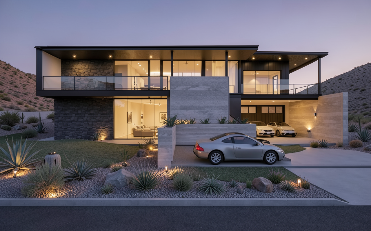 create a stunning architectural rendering of a modern home based on the floor plan use a clean sophisticated style with a serene atmosphere the walls should be a warm light beige floors are a light oak wood with a polished finish use large windows with sleek silver frames to enhance natural lighting for the dining and living areas include minimalist furniture in neutral tones with accents of deep blue and teal add lush green plants for a touch of nature the balconies should have glass railings and cozy seating in soft gray overall aim for an open airy feel with an inviting and elegant ambiance find a way to enlarge the closet room for the smallest bedroom do not modify balconies