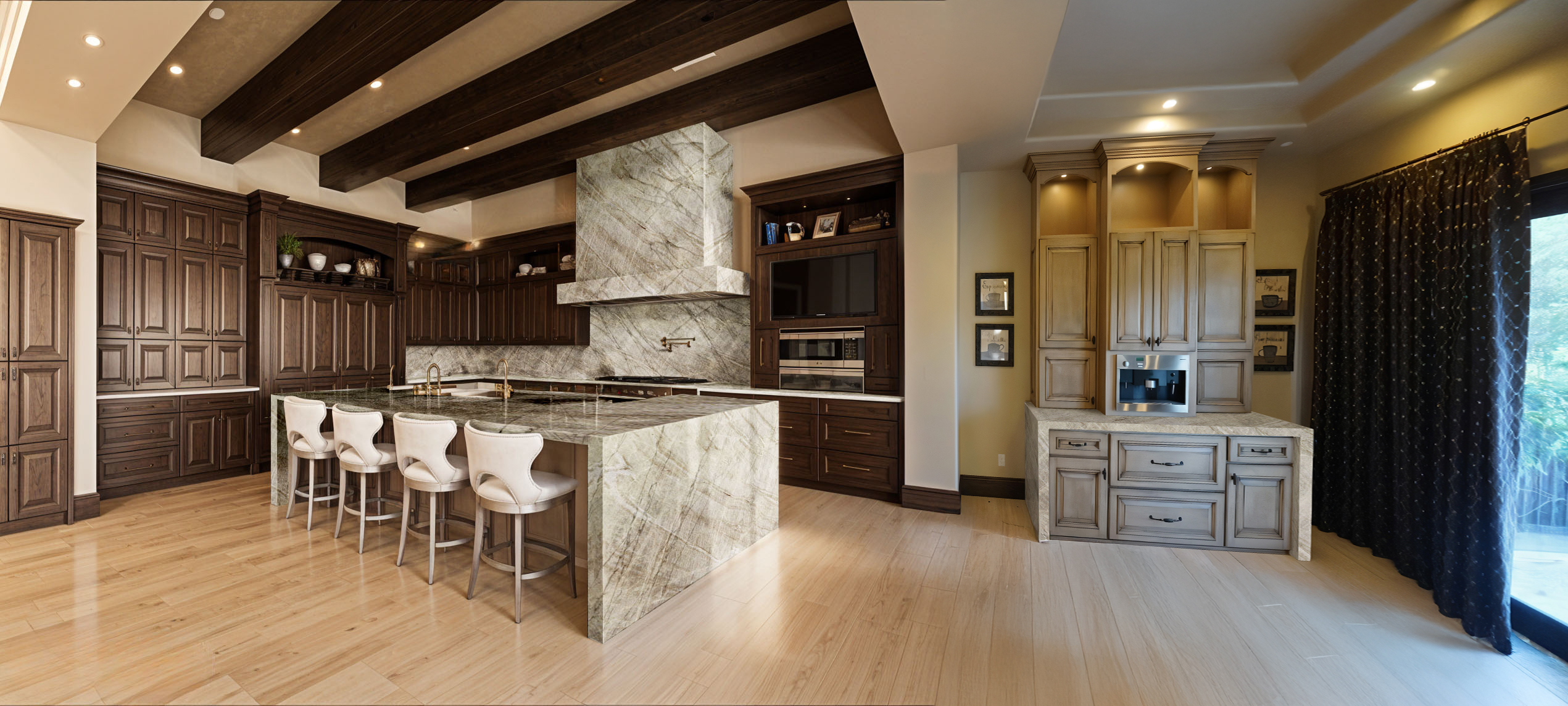 do not change anything but the hood change the hood to be one piece no band at the bottom and make the hood fluted natural marble stone make the side edge of the kitchen island fluted natural stone marble that matches the hood