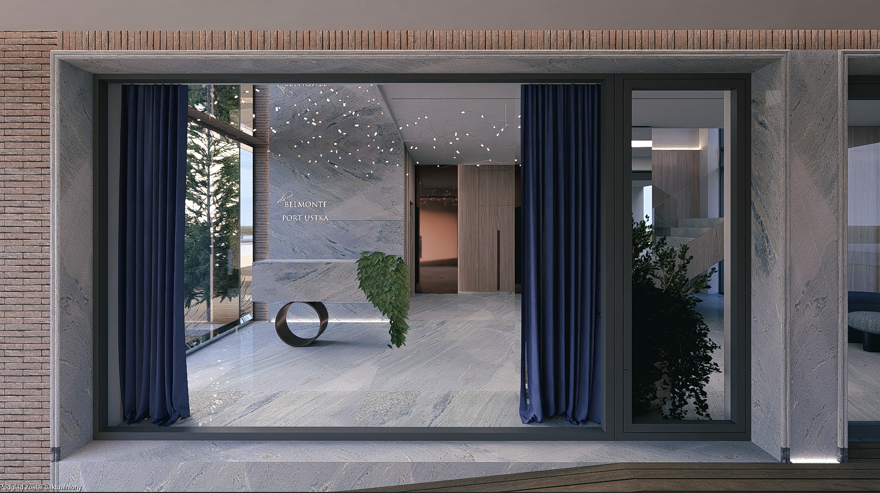 photorealistic render cobalt colored velour curtains quartzite stone cielo azul on the floor and wall glowing belmonte port ustka sign stone wall lit from below walnut wood warm elegant lighting above the reception a ceiling made of mirrors and lamps by moooi with copper wires and tiny lights