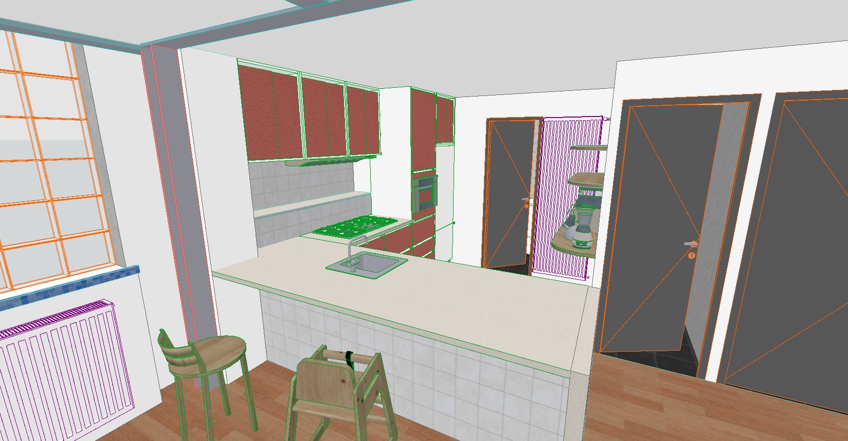prompt archsynth ultra verrouill et hi rarchis final 1 g om trie et agencement strictement inchang s aucune modification des volumes proportions positions ou dimensions poteau m tallique profil en h d j repr sent sur l image ne pas modifier briques carreaux de verre g om trie inchang e aucune alt ration ou ajout radiateur derri re les 3 tag res m me style que le radiateur sous les briques de verre ne pas modifier la g om trie 2 mat riaux et surfaces seulement ces l ments peuvent tre ajust s carreaux briques de verre opacifi s laisser passer uniquement la lumi re naturelle l ments m talliques gris anthracite autres murs blancs fa ades et caissons de cuisine terracotta claire uniformes plan de travail b ton cir tr s clair effet proche blanc craie cr me nuanc cr dence carreaux blancs avec joints bleus 3 clairage 100 lumi re naturelle provenant uniquement des briques de verre aucun clairage artificiel pas de plafonniers lampes ou spots 4 restrictions strictes aucun autre l ment ne doit tre ajout supprim ou modifi seules les textures et mat riaux list s peuvent tre ajust s