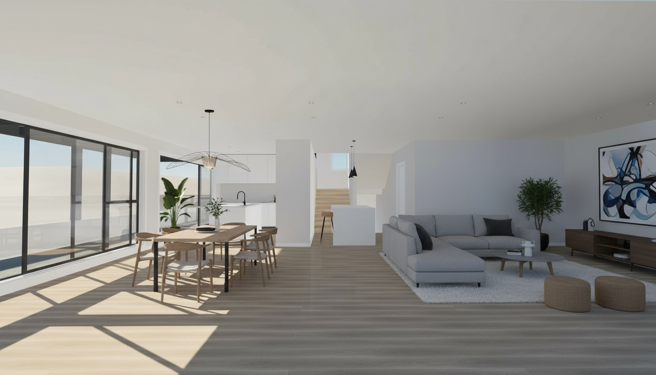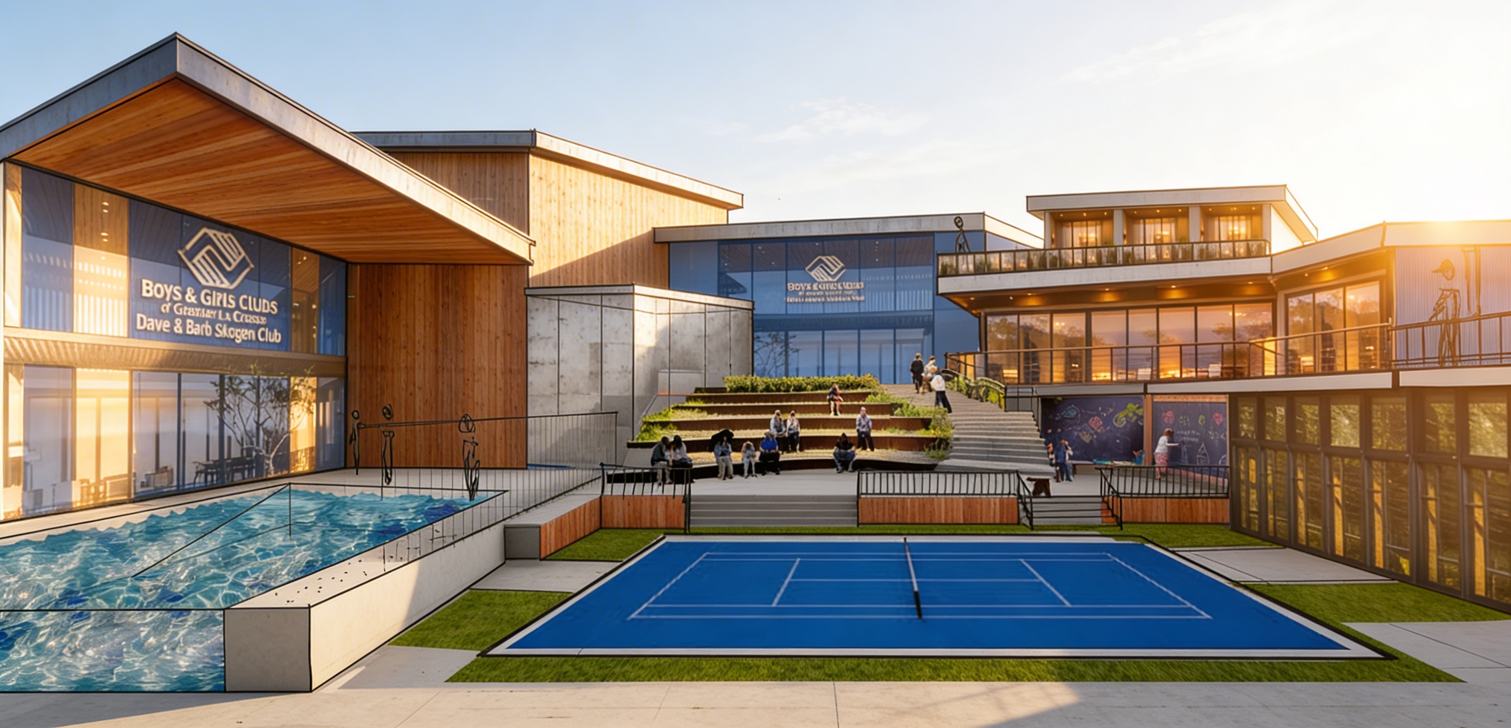 transform this architectural rendering into a highly photorealistic rendering for a boys girls clubs of america facility rendering should feel dynamic bright lively and photorealistic preserve overall materials composition etc of original image courtyard organization with central court terraced seating style direction maintain a schematic diagrammatic clarity subtle linework and clean edges simplified geometry where appropriate blend with realistic material rendering hybrid style warm wood siding with visible grain and tonal variation transparent and lightly reflective glass with soft interior very subtly glowing from within concrete paving and metal panels with natural texture and slight imperfections avoid overly glossy or hyper polished finishes lighting atmosphere golden hour lighting streaming directly into the courtyard courtyard faces south color palette warm woods soft neutrals and fresh greens bright but balanced tones that feel welcoming and youthful overall goal create a presentation ready schematic rendering that feels bright welcoming combining clear architectural communication with believable materials and atmosphere rendering should feel dynamic and lively