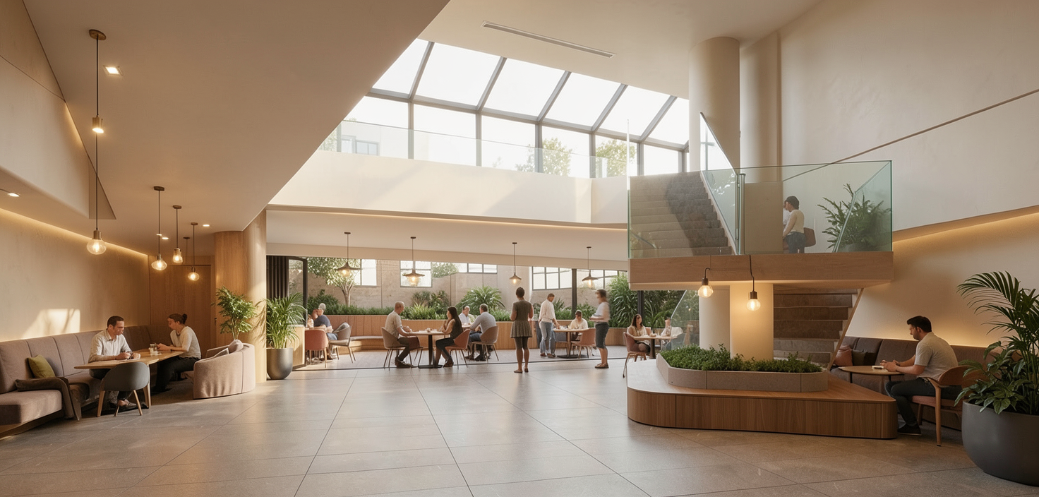 design this outdoor patio commercial office space think tensile shade pieces planters seating softseating on paver ground planting modern