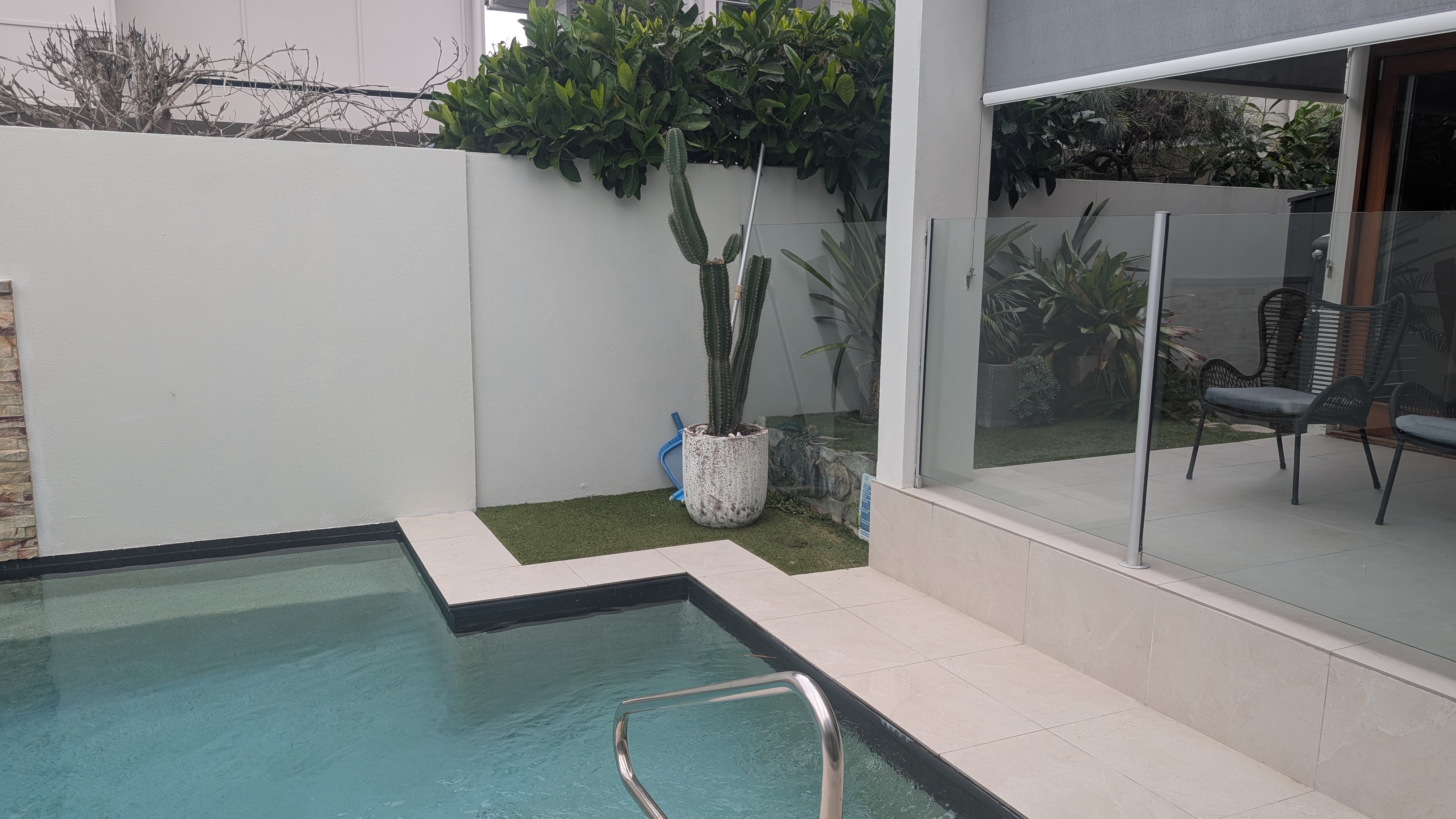 modernist exterior shot add two additional sculptural pots beside the existing white cactus pot in the poolside area match the existing pot s style white textured cylindrical one larger pot should be placed slightly to the left containing a tall upright san pedro cactus echinopsis pachanoi alongside a prickly pear cactus opuntia species arranged for balanced sculptural contrast one smaller pot should be placed to the right containing a mix of golden barrel cacti echinocactus grusonii and compact agaves such as agave parryi or blue glow ensure the new pots and plants are integrated with correct lighting scale and shadows to match the original environment giving a natural and realistic appearance architecture
