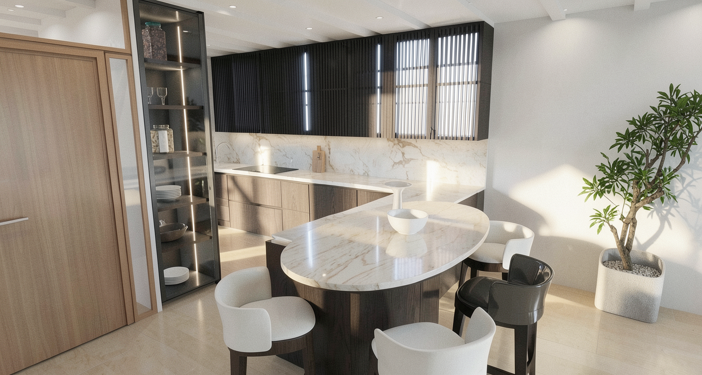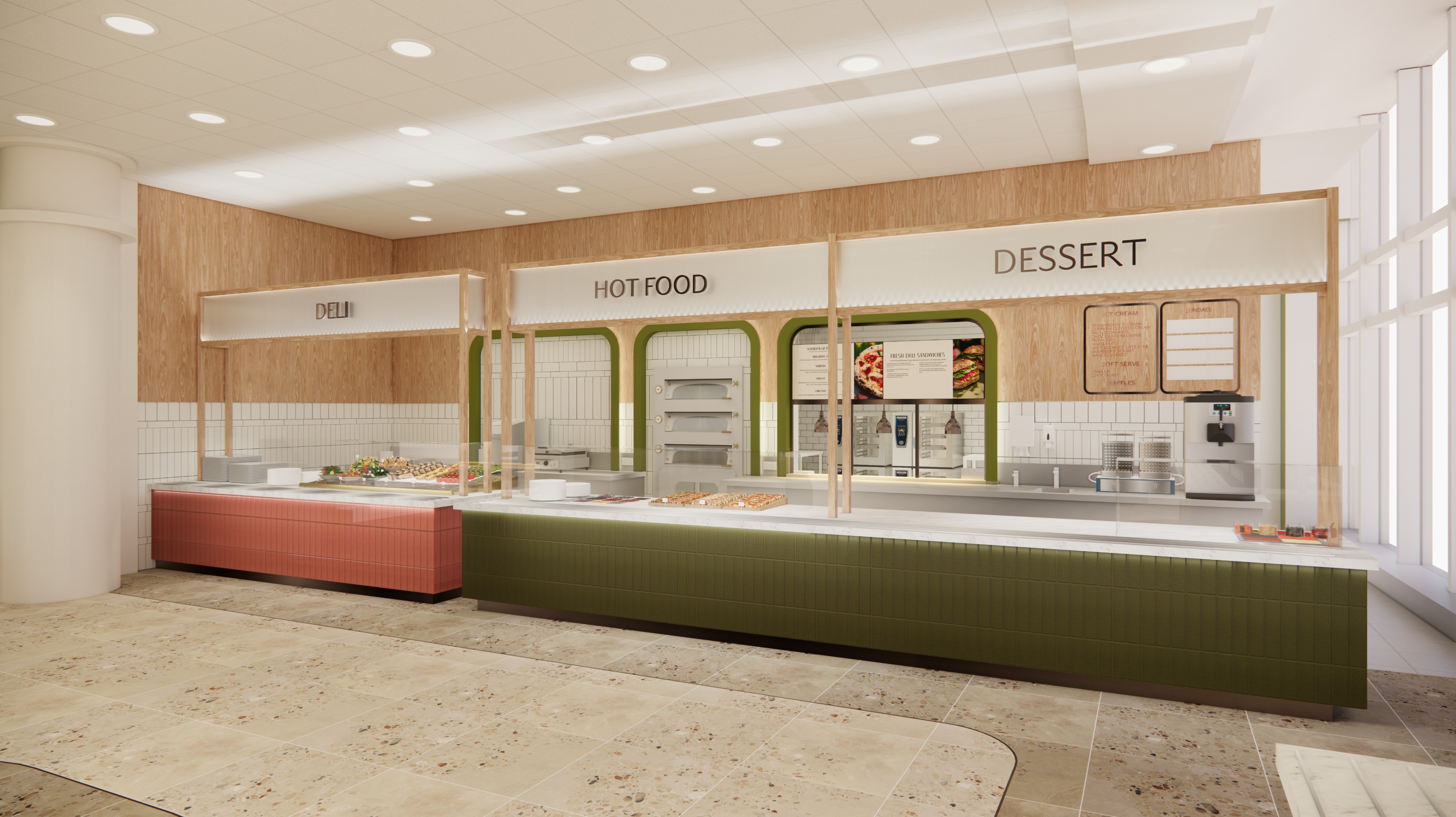 this visual shows resturant cafe counters do not change anything about this image just add people using the space naturally add people working behind the counters add people waiting to be served dont change the image