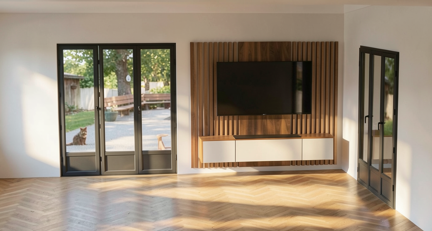 flooring in white oak texture porcelain tile the center mirror borders are lighted those inclined panels on both sides of the center mirror are mirrors too