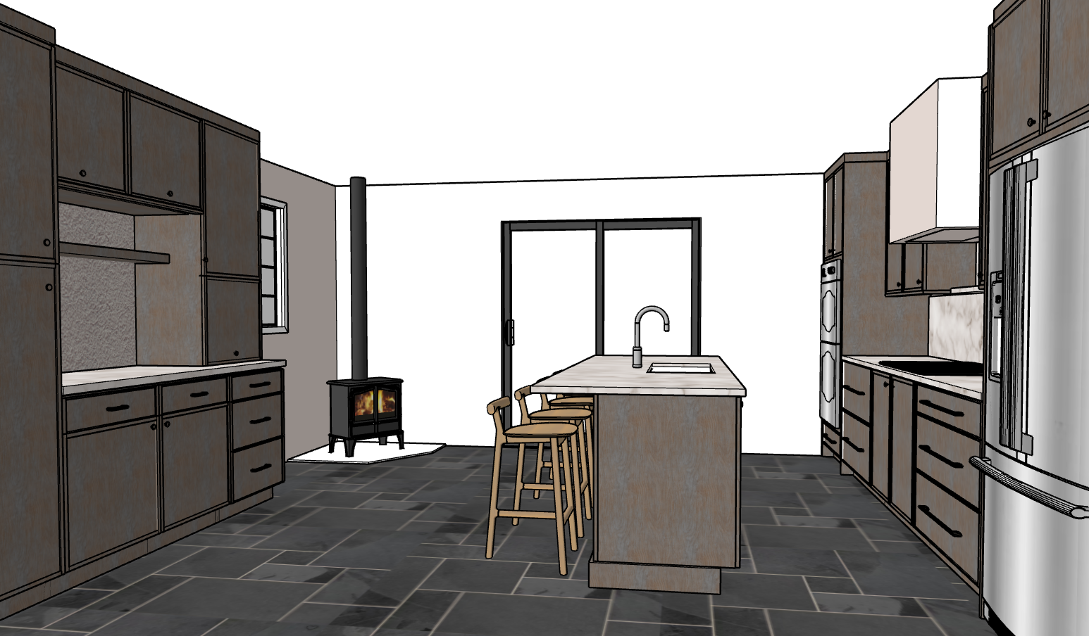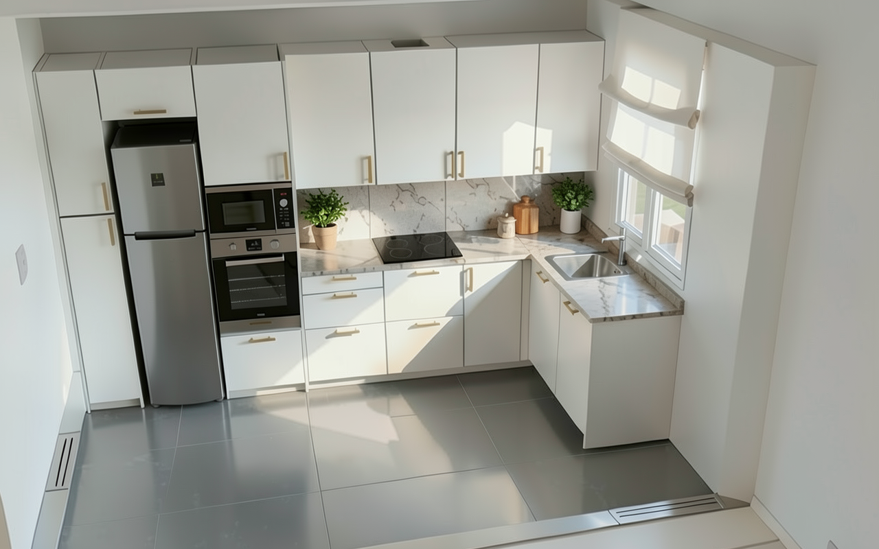 render this kitchen with realistic lighting and recessed ceiling lights to brighten the space keeping the materials in the model