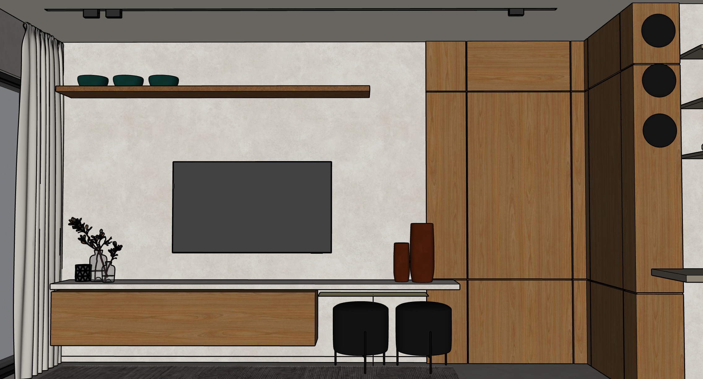make a photorealist render natural light sumer day the spots onthe roof are lit the black wall sconces are lit