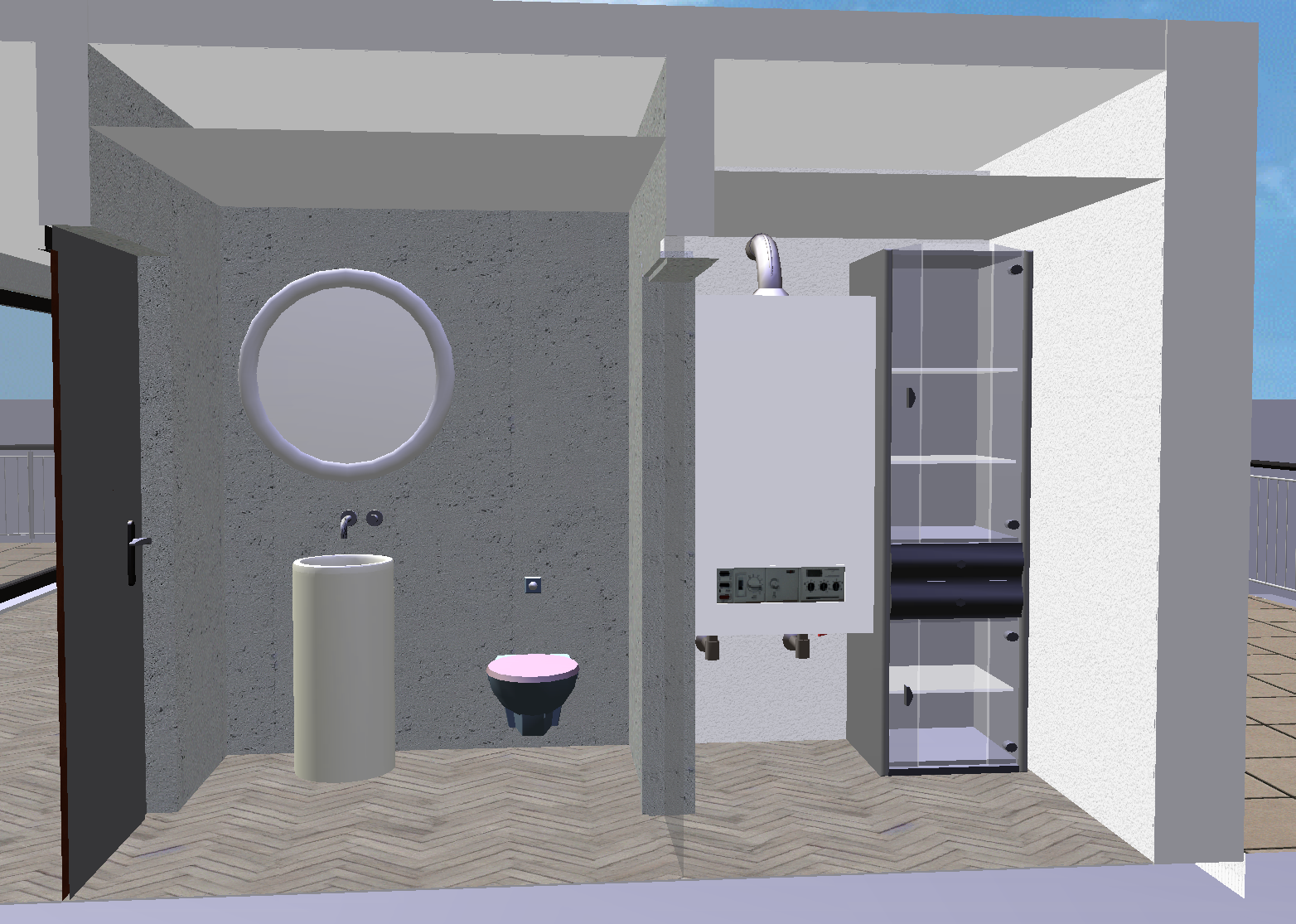 genau dieses rendering berarbeiten fotorealistisches innenraum foto exakt dieselbe perspektive und kameraposition wie das hochgeladene referenzbild 100 identische raumgeometrie exakt gleiche m belanordnung exakt gleiche verlegeart und richtung von parket wie vorlage parket ruhig und hellgrau weiches nat rliches tageslicht raum k nstlich ausleuchten sanfte realistische schatten realistische materialien echte holztexturen hochwertige oberfl chenreflexionen lavabo aus marmor collemandina grigio in braungrau dunkel dahinter eine gessi wandarmatur edelstahl vollkommen rahmenloser und hinterleuchteter spiegel mit echten spiegelungen modell circus 90 cm von antoniolupi rechts davon die toilette in weiss matt toilette modell laufen riva tecelux bet tigungsplatte aus glas weiss toilettenpapierhalter in edelstahl mit papier rechts von der toilette alle sichtbaren grauen w nde seite sind sichtbeton rechts weissputz weiss links vom lavabo eine kurze handtuchstange mit weissem handtuch schwarze steckdose rechts vom lavabo auf gleicher h he wie die armaturen im raum rechts ist die technik es ist ein l ftungsger t aufgeh ngt daneben steht rechts das rack mit der haustechnik und den computern in beiden r umen abgeh ngte decke links abgeh ngt auf 2 30 meter rechts auf 2 20 meter schwarze runde deckenspots in der abgeh ngten decke sehr moderner minimalistischer look nat rliche farbwiedergabe golden hour feeling hell ausleuchten eine echte frau mit blonden haaren steht vor dem lavabo die frau ist 170 cm gross das bild muss wie eine professionelle fotografie aussehen es soll ein echtes und reales foto sein canon eos r5 35 mm festbrennweite f 2 8 hyperrealistisch dslr qualit t raw aufnahme 8k aufl sung extrem scharf perfekte tiefensch rfe professionelle architekturfotografie