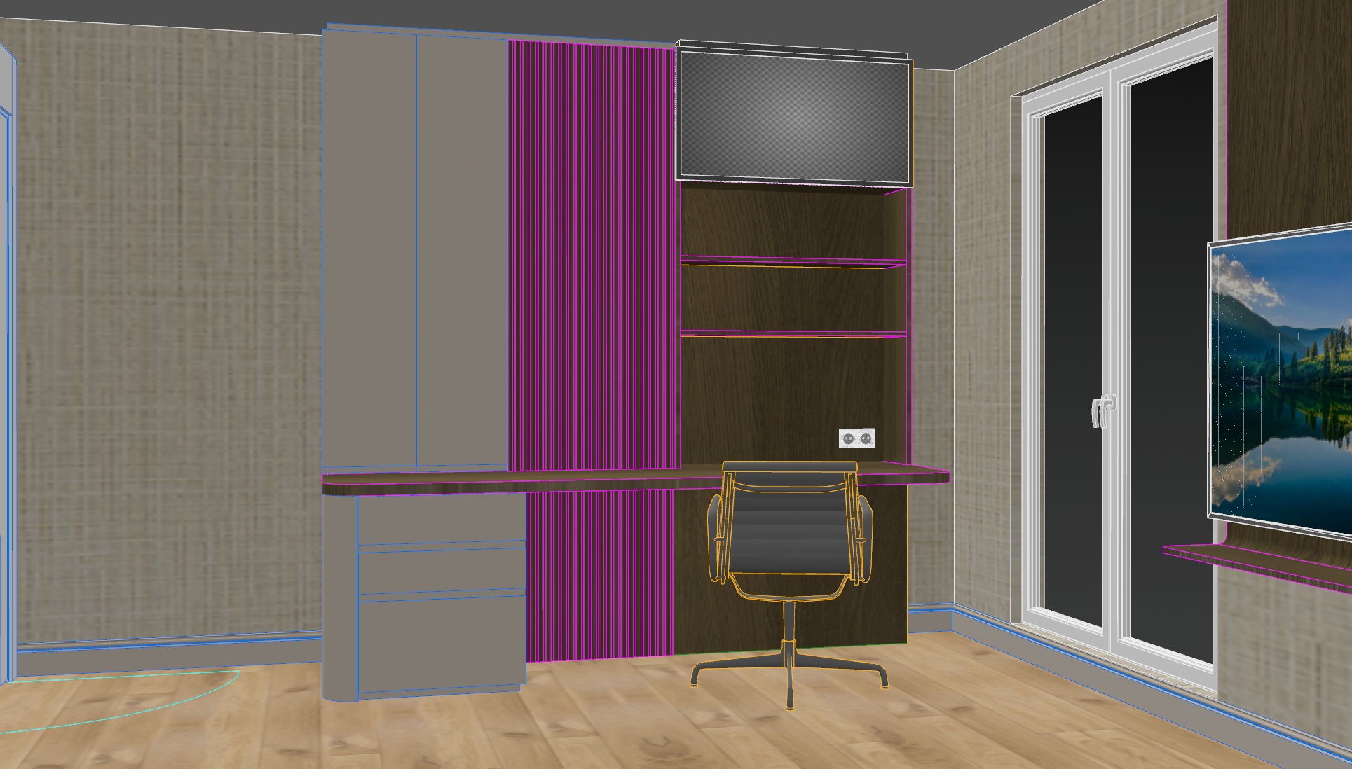 there should be spot lighting on the ceiling there should be a sea view from the window there should be led lighting under the shelves there should be a monitor on the desk in front of the power outlet the office chair should be leather the shelves should have anthracite framed metal wire look doors on top the blue striped areas should have beige colored doors the details should remain the same the pink striped areas should be dark wood the floor covering should be parquet there should be a red patterned rug on the parquet there should be books on the shelves