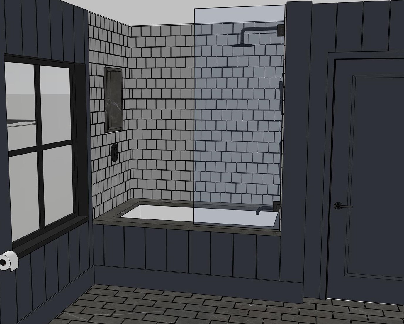 add daytime light for a bright and airy feel moody grey stone floors blue baseboard add overhead ceiling lights add tree view out of window