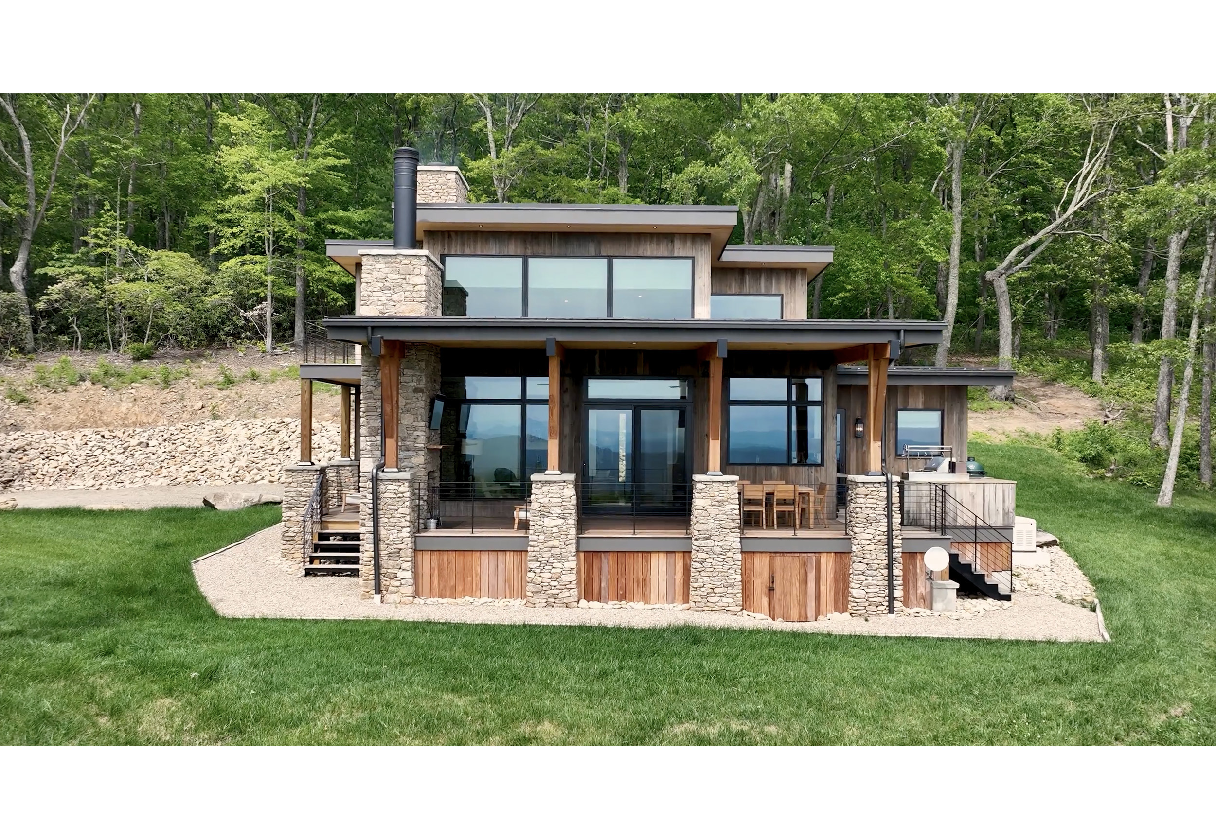 infill lush lawn with some tall grasses keep rocky path around house add native bushes