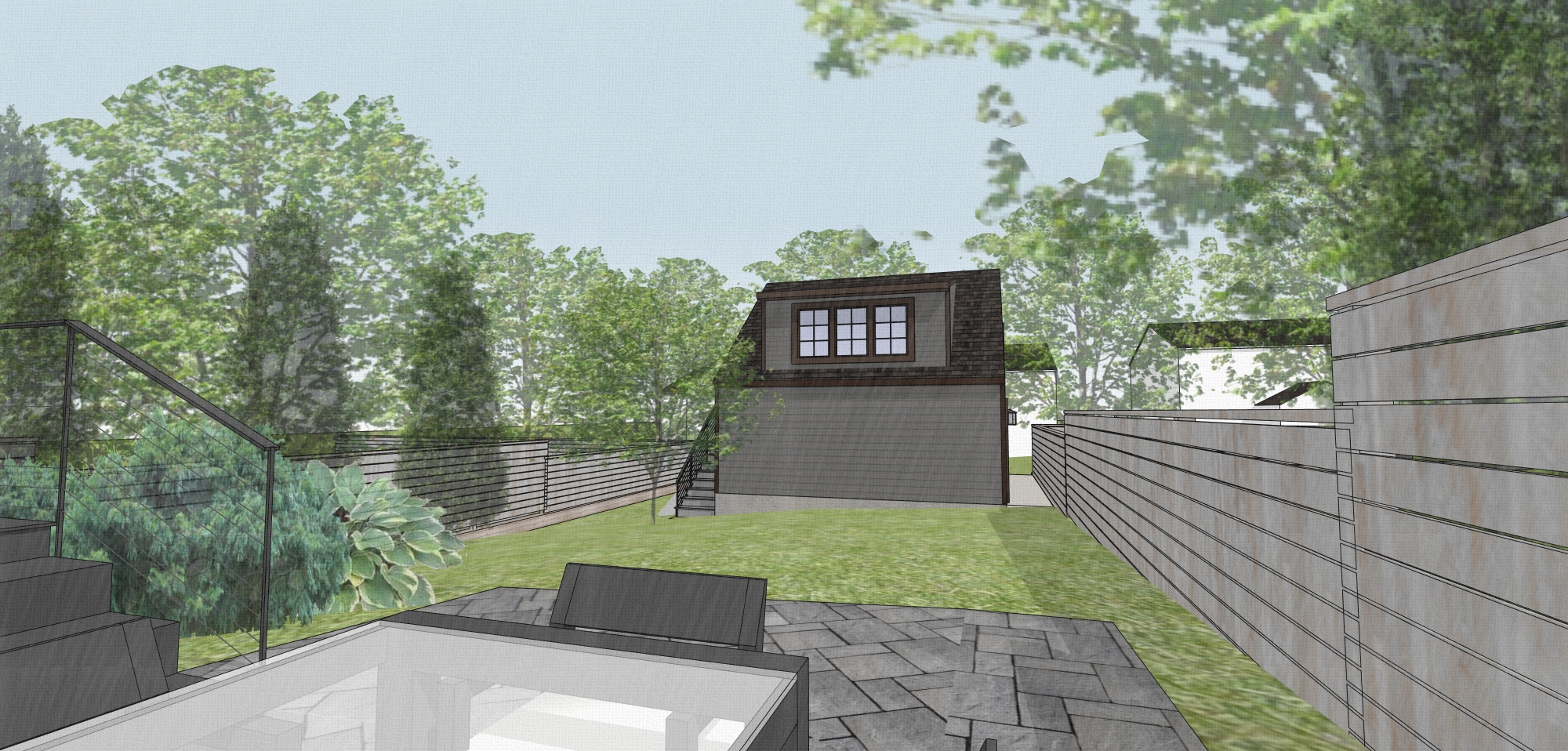 realistic gray brown siding and dark brown trim bright day light wood fence