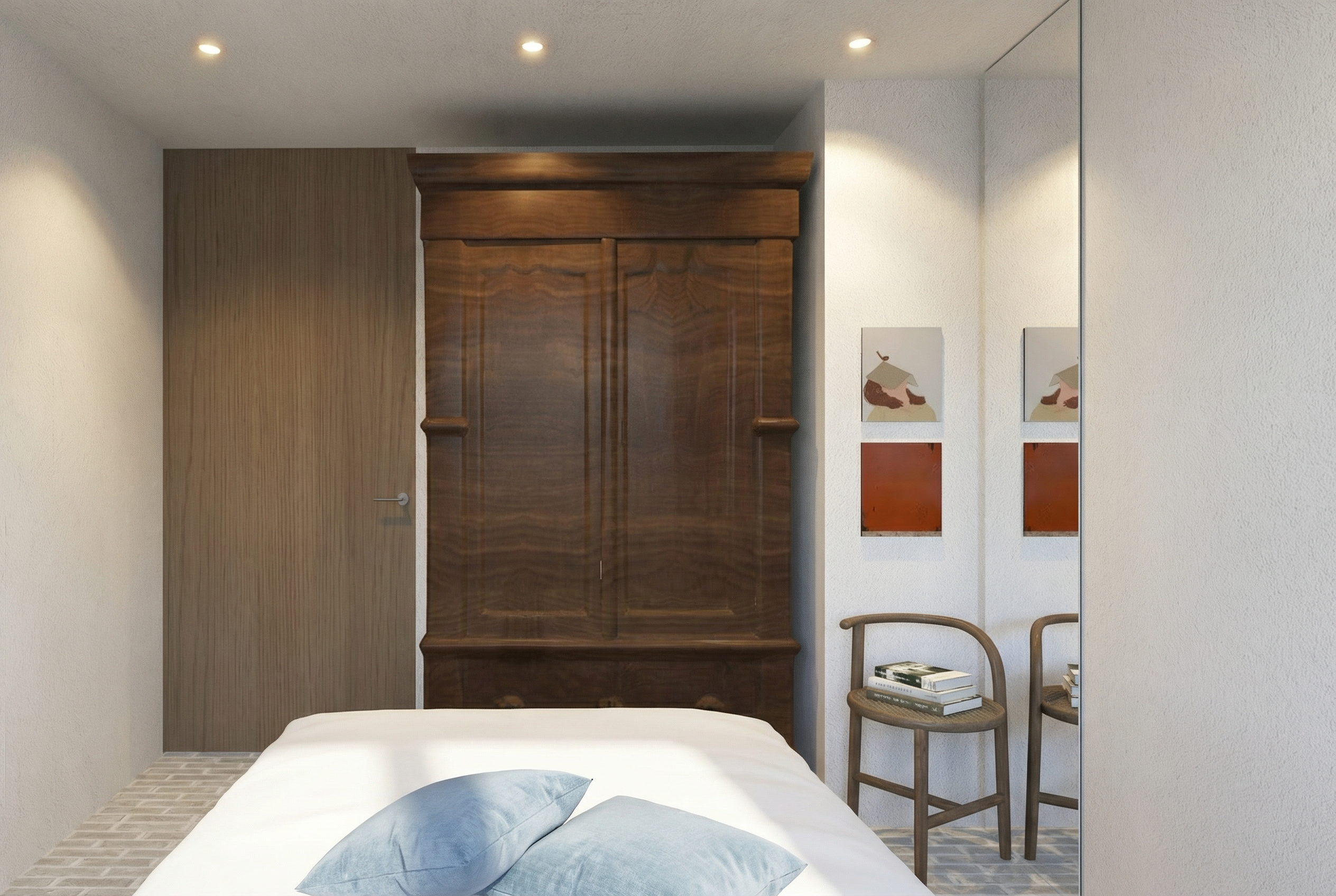 photorealistic interior elevation rendering of a modern bathroom bright 3000k natural interior lighting do not add windows do not add doors clean editorial interior photography style soft shadows high contrast between warm wood tones and cool sage green tile spa like upscale residential feel layout shows illuminated rectangular mirror with thin polished nickel frame centered above a undermount single sink vanity with two door cabinet base flanked by open wall space painted soft warm white cream on the left with a toilet to the right and a tiled shower enclosure on the far right with a wall mounted shower head vanity countertop in white grey veined marble vanity base cabinet in warm natural white oak wood with flat front double doors and polished nickel hardware undermount white ceramic sink with polished nickel faucet floor tile in small white matte geometric mosaic arabesque quatrefoil pattern double door medicine cabinet in warm natural white oak wood with fluted glass panels inset in cabinet doors centered above toilet toilet is white shower wall tile in 2x6 vertical stacked sage green ceramic subway tile wall behind toilet has the same green tiles stacked up to 46 remaining walls painted soft warm white cream single wall sconce mounted above the vanity mirror in polished nickel with a polished nickel conical dome shade and exposed edison bulb emitting soft dim 2700k light