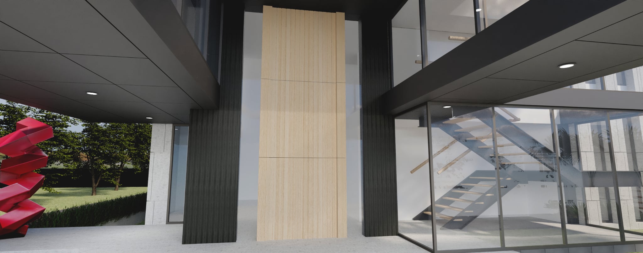 wpc wood cladding color black on walls double height door in light oak finish aluminum cladding black silver color clear glass beside main door