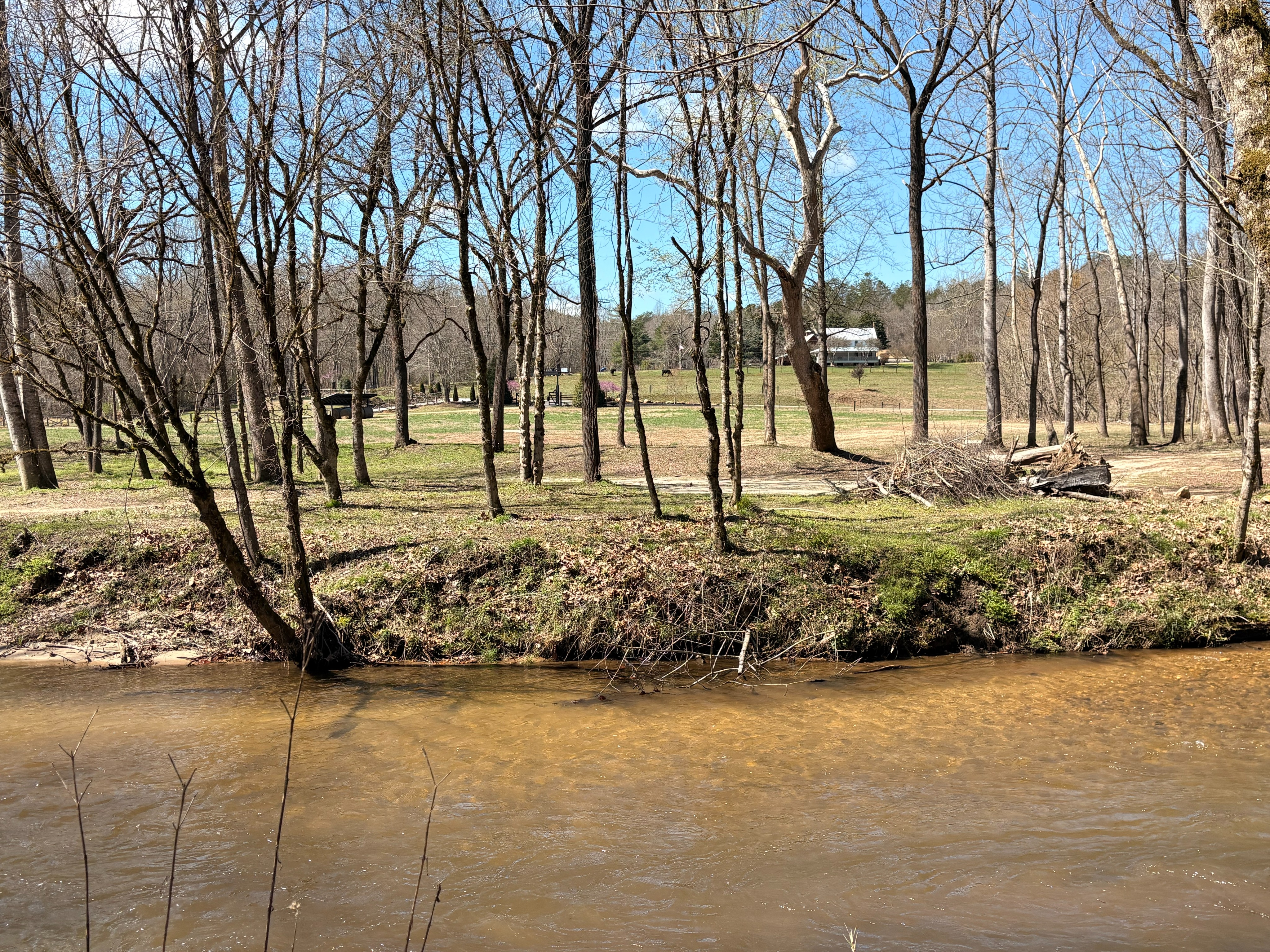add rustic riverside pavilion edge of river bank of river make water slightly better color add leaves to trees pavilion to be long and linear parallel with the river hanging over the water rustic style overall with string lights