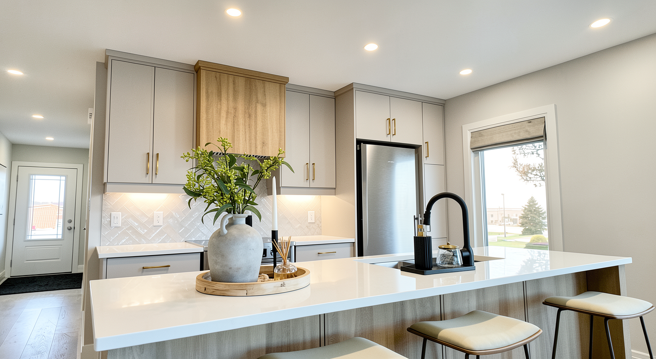 create an ultra realistic image from this jpg add ceiling spot lights use soft light wood textured to the floor and use warm off white for walls and the ceiling is white and add indirect light to the shelves add some decoration and add indirect light to the wood ceiling panel add soft outdoor light the wardrobe door using cream color jangan mengubah atau menambah desain