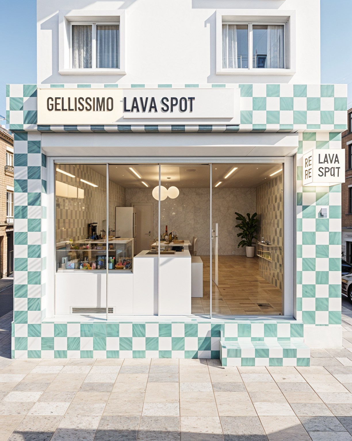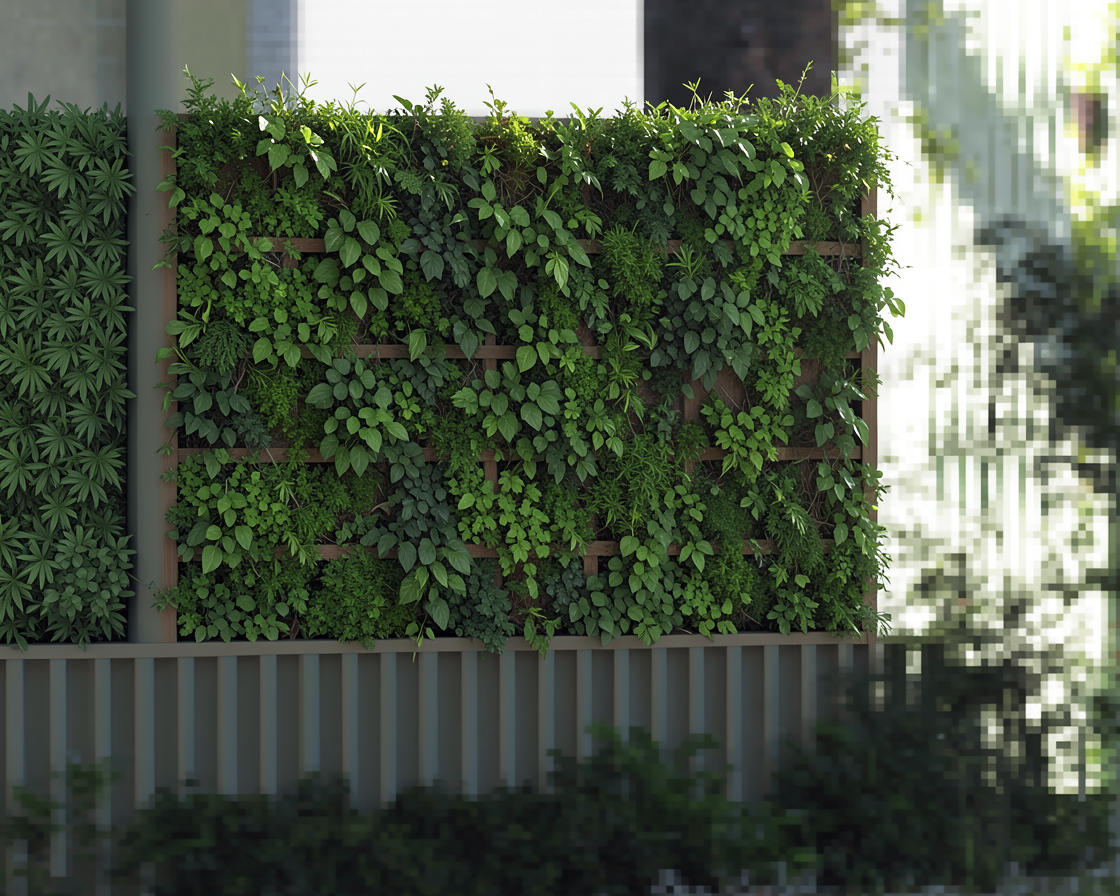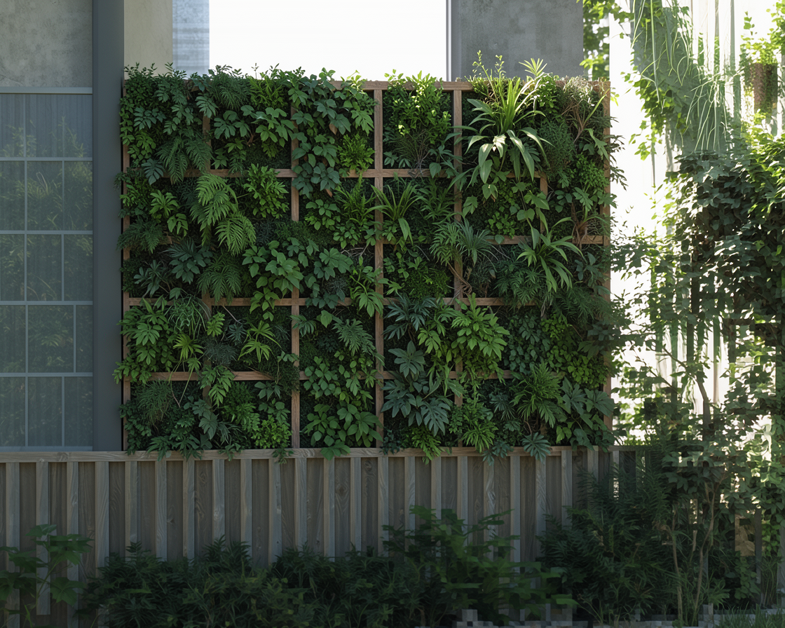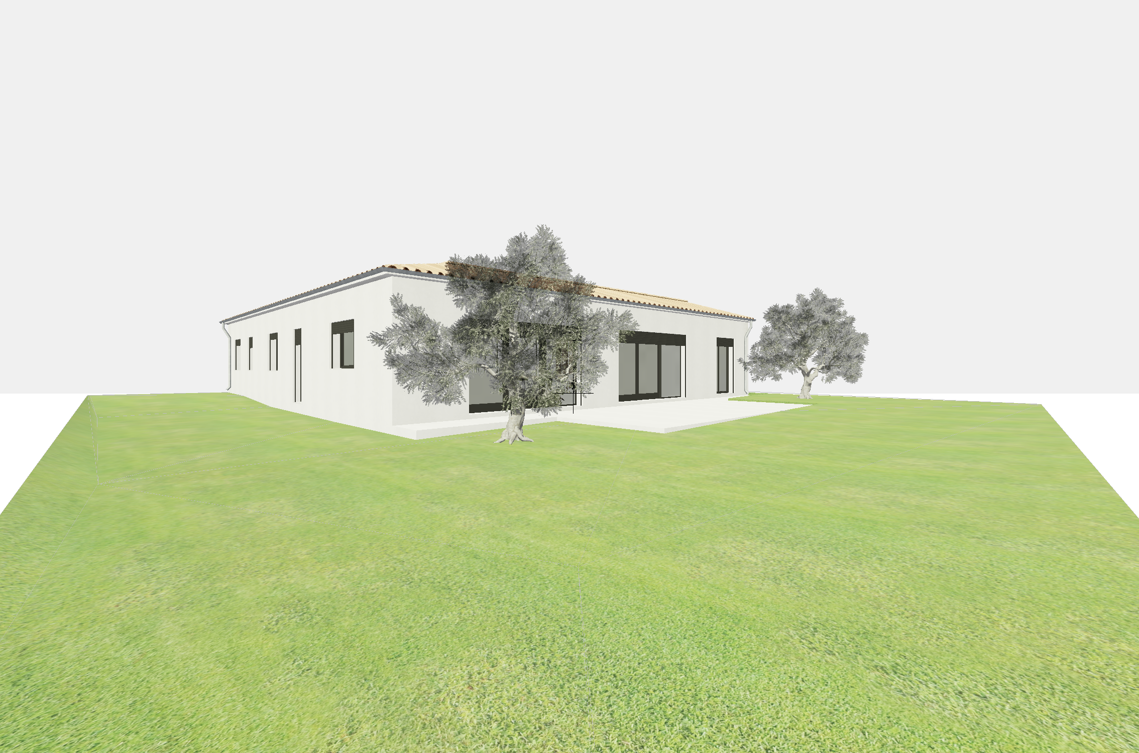 2 olive trees on each side of the terrasse and some mediterranean pine trees in the background add some palm trees and some lavender on the grass the plants are more organised there is a mix of lavender and other mediterranean plants
