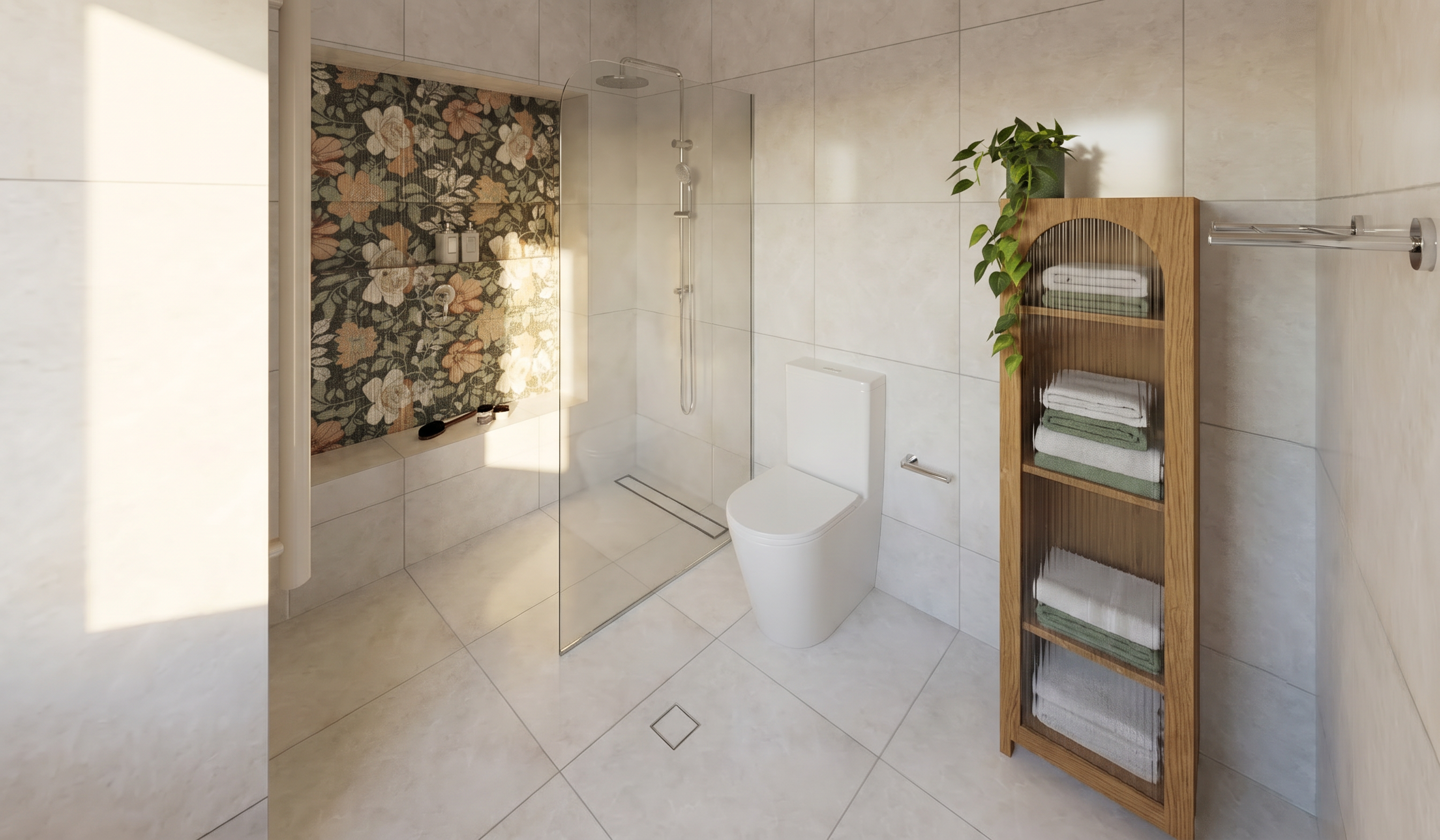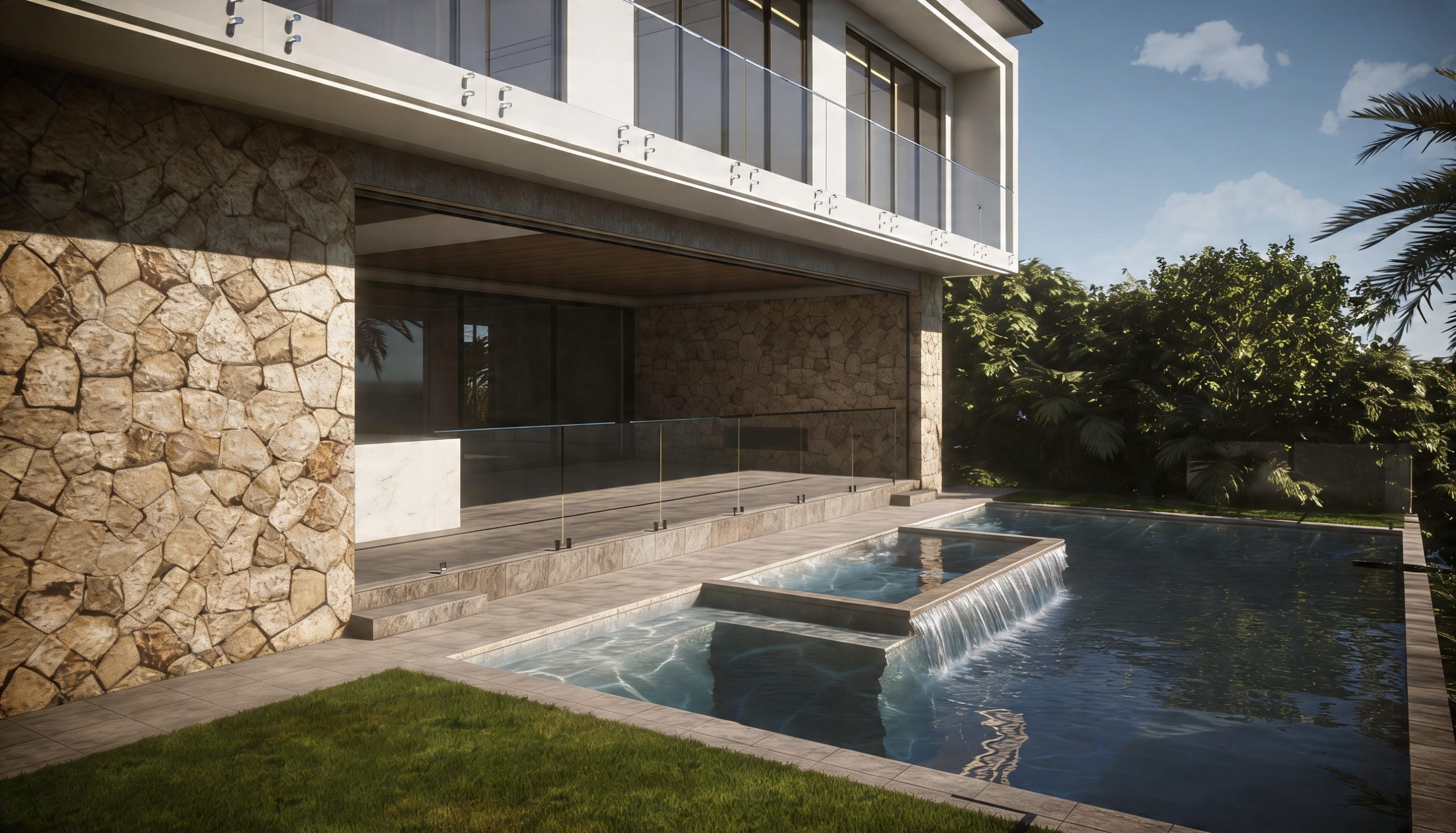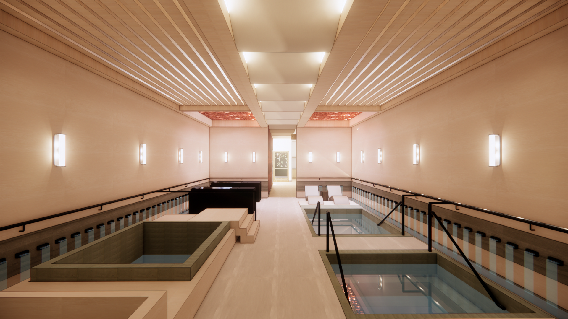 priority fixes execute these before anything else one the dappled oval light projections on the walls only appear in the zone directly beneath and adjacent to the terracotta perforated ceiling panel which is located in the middle section of the ceiling toward the back of the space the front and side walls have no scattered dot projections on them the perforated panel casts its dappled warm white light spots only onto the surfaces immediately below and around it walls and floor in that specific rear middle zone only the front portions of the side walls are lit only by the wall sconces if dot projections appear on the front walls or side walls far from the perforated panel it is wrong two there is no wave sculptural wall panel anywhere in this space no wave relief no undulating wall feature no layered wave artwork the center of the space between the pools is an open corridor with a dry porcelain tile floor only the back wall is a plain smooth plaster wall remove this element entirely three the ceiling has integrated cove lighting running along the edges where the wood slat ceiling meets the side walls a continuous warm white or soft amber led cove runs along both sides of the ceiling length washing the upper wall surface with a gentle upward and downward gradient of warm light additionally several discrete rectangular recessed light panels are flush in the central ceiling spine each a distinct rectangular aperture emitting soft controlled downward light evenly spaced no continuous bright strip lights running along the slat lengths four the pool platform coping surround and entry steps on the left pool must match the wall color warm beige to pale sand tone the same palette as the clay plaster walls not grey not green not concrete warm beige stone or plaster toned tile on all horizontal and vertical pool surround surfaces on the left side the pool water inside remains natural cool grey green the right pool surround can match as well five the wall water features running along both perimeter walls the vertical or sheet water elements mounted on the side walls must look like real falling water thin continuous sheets of water flowing down a stone or tile backing surface catching the sconce and cove light in natural highlights and soft motion blur the water reads as translucent slightly reflective and alive not a flat texture not a rendered panel not fake real water sheeting down a wall surface with natural light interaction preserve all existing materials and spatial layout exactly do not add or remove any architectural elements not described above ceiling is warm natural wood slats thin parallel honey toned oak or cedar strips running lengthwise matte natural finish with visible grain variation the terracotta perforated panel is a secondary ceiling element in the middle rear zone only warm orange red tone backlit by natural daylight filtering softly through organic oval perforations its dappled light projections fall only on the immediate surrounding walls and surfaces in that rear zone walls are smooth warm clay plaster in pale peach sand tone matte and chalky wall sconces mounted at regular intervals on both sides emit soft warm diffused light gentle and ambient not overexposed perimeter handrails above pool surrounds have integrated cove lighting on their undersides warm amber led strip casting a soft downward wash onto the pool coping and tile below both pools are recessed lined with muted sage green ceramic tile in small square format pool water is clear with a subtle cool grey green tint natural calm not vivid blue black metal entry handrails at pool steps two white lounge chairs on the right pool surround dark plunge tub at the far left end floor is large format rectified porcelain tile in a light grey tone matte surface visible grout lines clean and dry not wood look in this render cool grey porcelain natural daylight enters from the far end opening soft and diffused washing the back wall with cool neutral light and drawing the eye down the corridor post processing and finish heavy coarse analog film grain throughout kodak portra 800 pushed two stops grain visible across all surfaces equally color muted and slightly desaturated shadows softly lifted not fully crushed warm vignette at all four edges medium format film photograph scanned on uncoated matte paper collage editorial quality materials feel hand composited water surfaces have a slightly graphic printed flatness not a clean cgi render handmade architectural mood board aesthetic