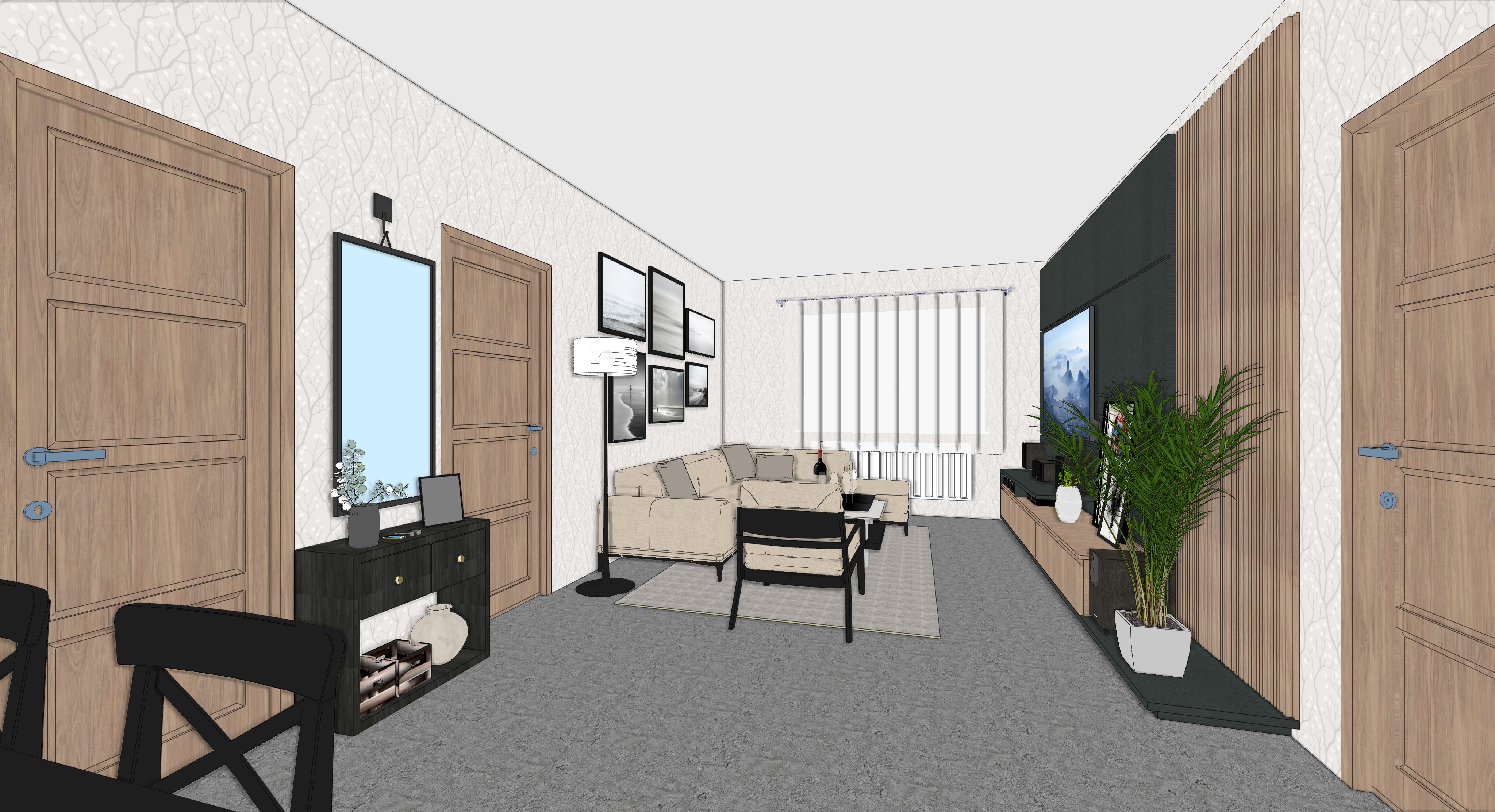 render a modern living room with a minimalist design the atmosphere should be cozy and inviting with soft natural lighting streaming through a white semi transparent curtain the walls are adorned with subtle floral textured wallpaper in light gray doors are crafted from light oak wood with blue metallic handles a beige l shaped sofa is the centerpiece with coordinating cushions a black and white rug is placed under a simple black coffee table wall mounted monochrome photographs add elegance one wall features floor to ceiling wooden slats in a warm oak finish with a large sleek black tv indoor plants in white ceramic pots add a touch of nature the floor is covered in a textured gray carpet the overall color palette is neutral and harmonious emphasizing tranquility and modern sophistication