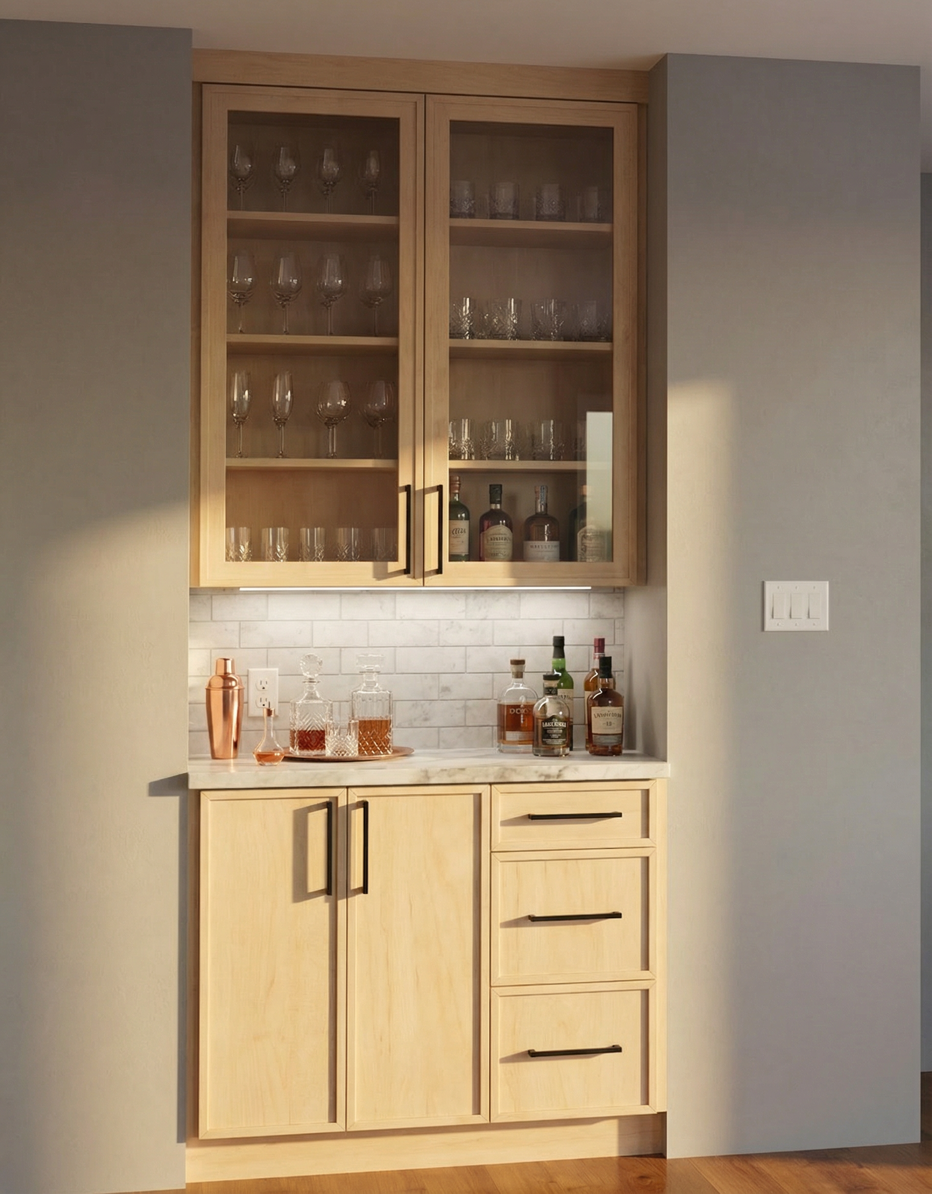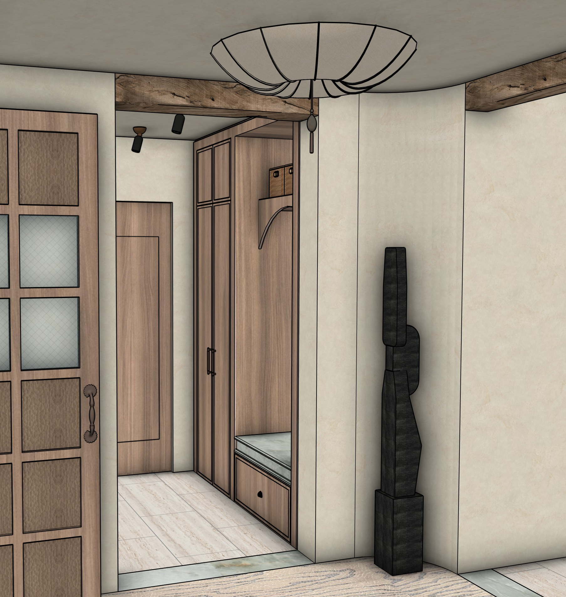 ceiling light is a asian style fabric with tassle timber is a warm muted mid tone not light not dark walls are a warm offwhite limewash
