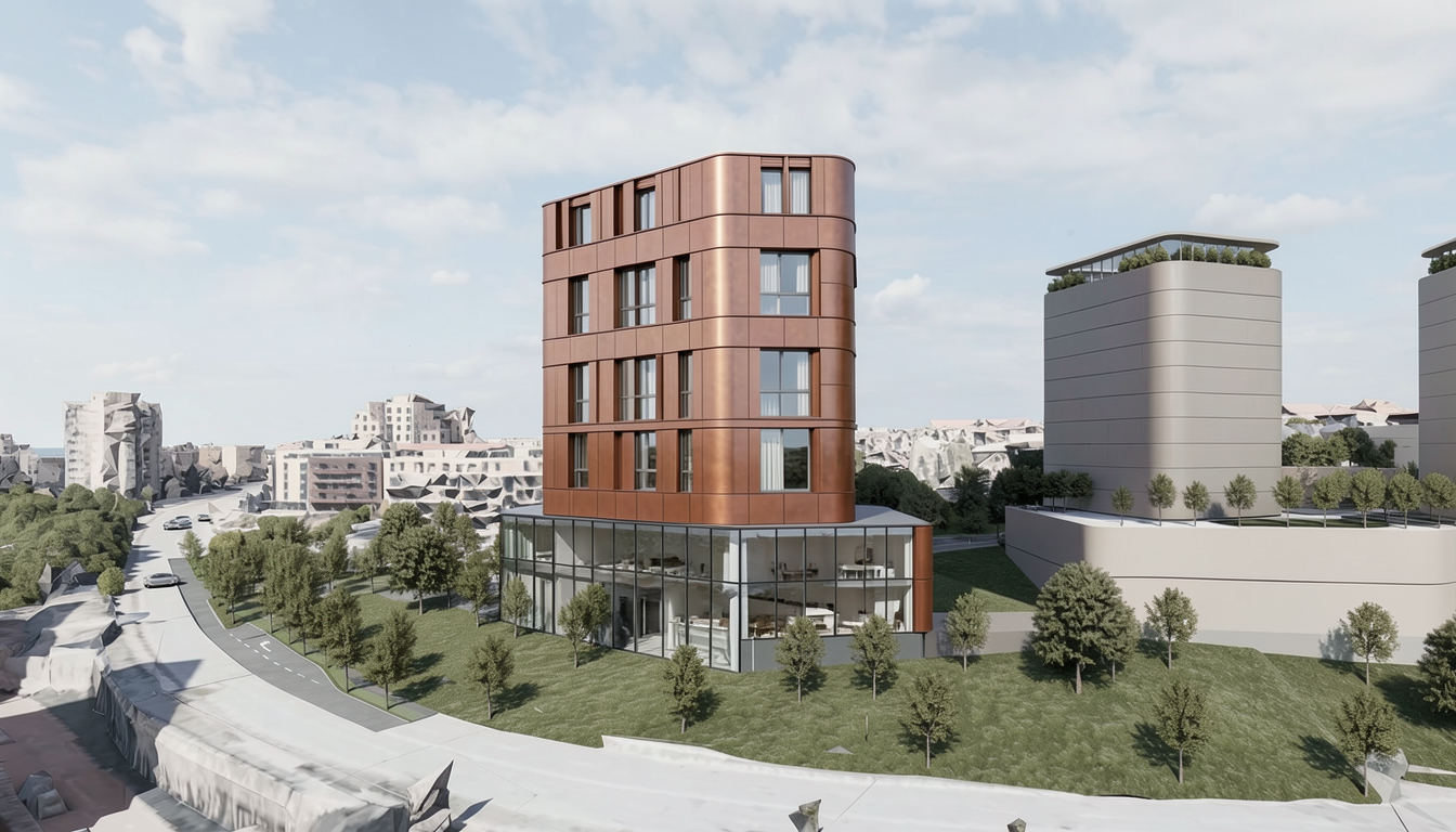 in the central part insert the trees as shown in photo 2 for the buildings on the left create the facades as seen in photo 3 elevations for the buildings on the right create structures clad in micro perforated metal panels with windows render it realistically and add details such as people benches and street lamps