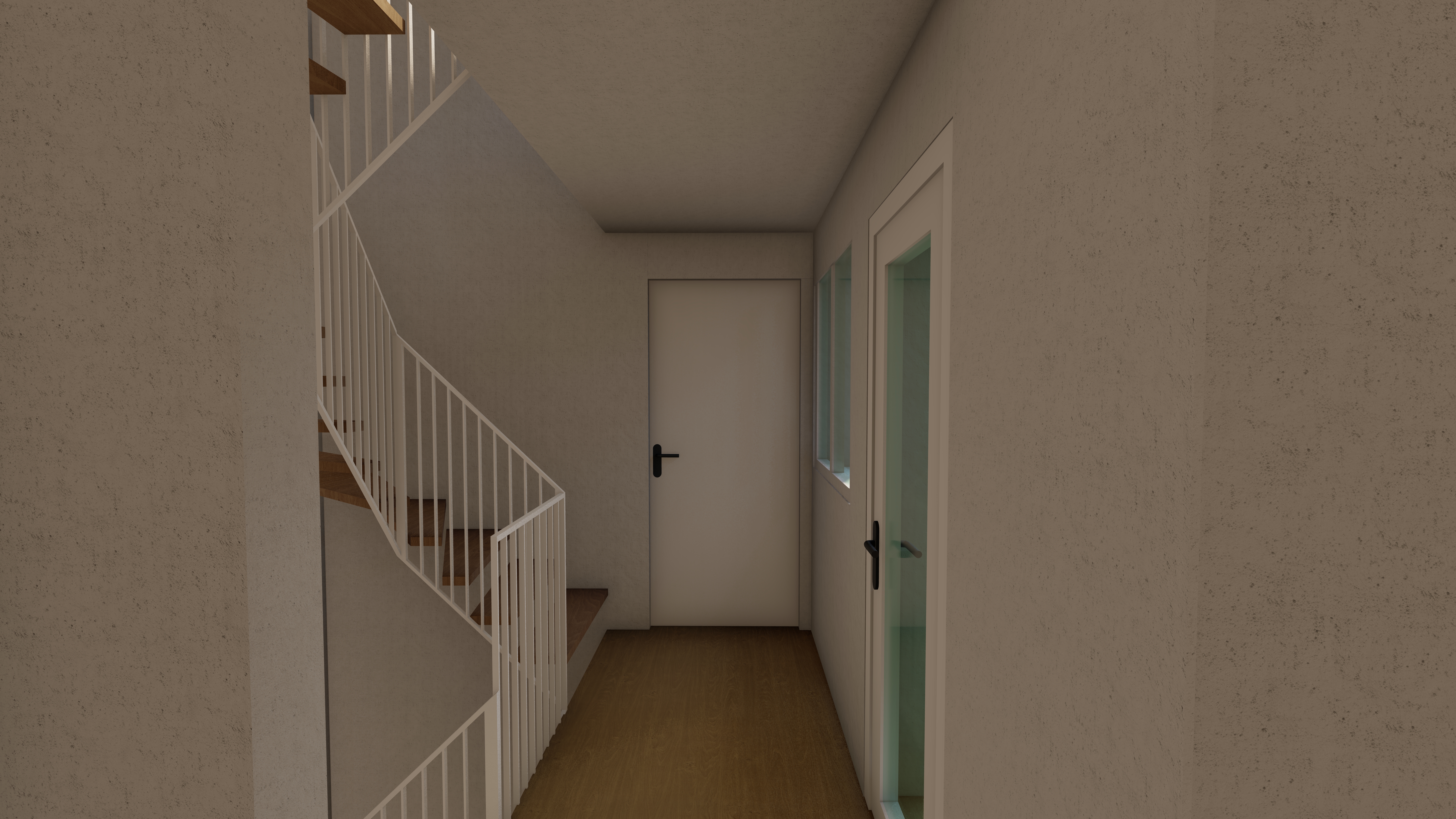 make the space bright it is essential that the top of the window is perfectly aligned with the height of both doors on the right side the outside should be visible showing the terrace the overall atmosphere must be warm and full of natural light