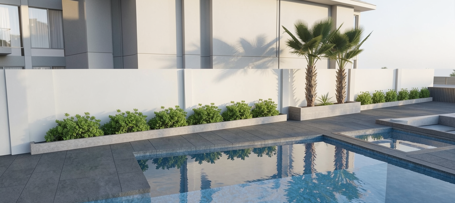 render a modern outdoor space with clean minimalist lines use soft beige for the wall in the background complementing the lush greenery of the bushes and two majestic palm trees the pool water should be a calming crystal clear blue reflecting the serene sky above the pool edge and planter beds are sleek and contemporary with a light stone texture the patio flooring is matte charcoal grey creating a chic contrast the atmosphere is tranquil inviting and sunlit evoking a sense of luxury and relaxation