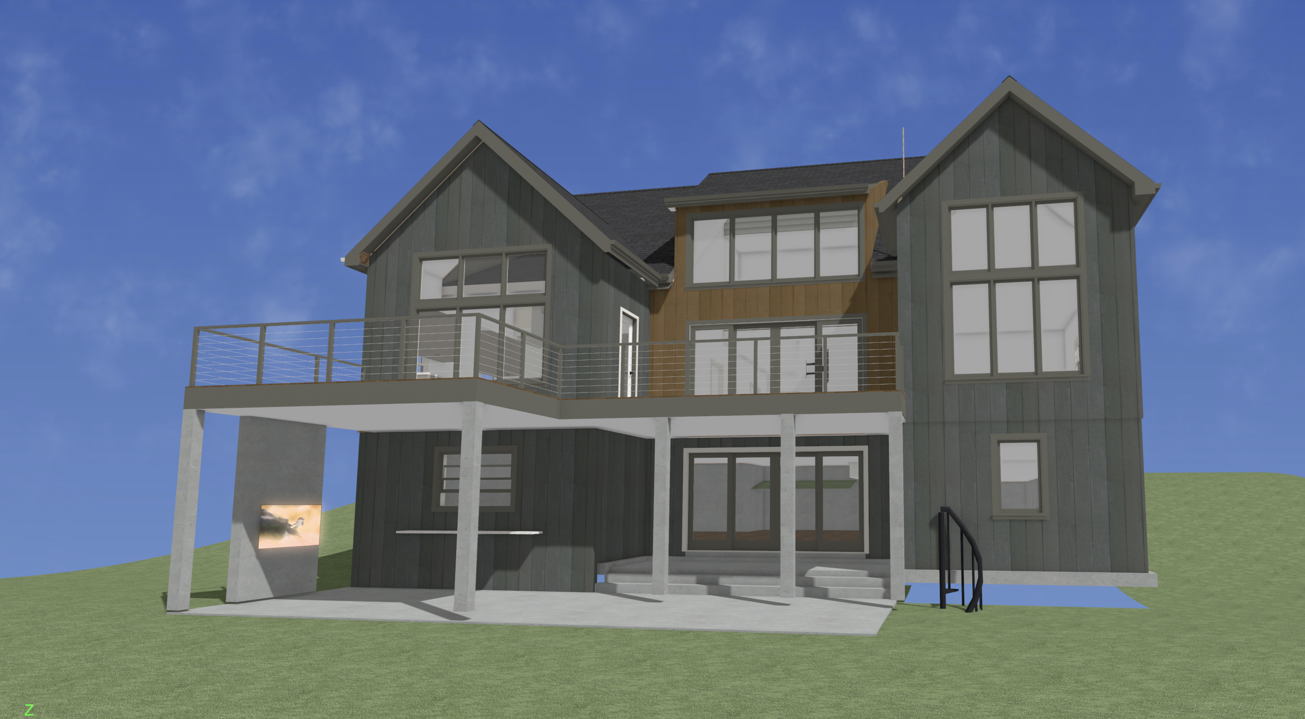 make this be set in the woods make the outdoor area under the deck furnished with modern furniture make the lighting warm golden hour lighting add landscaping along the foundation dont change any struture of the building or color