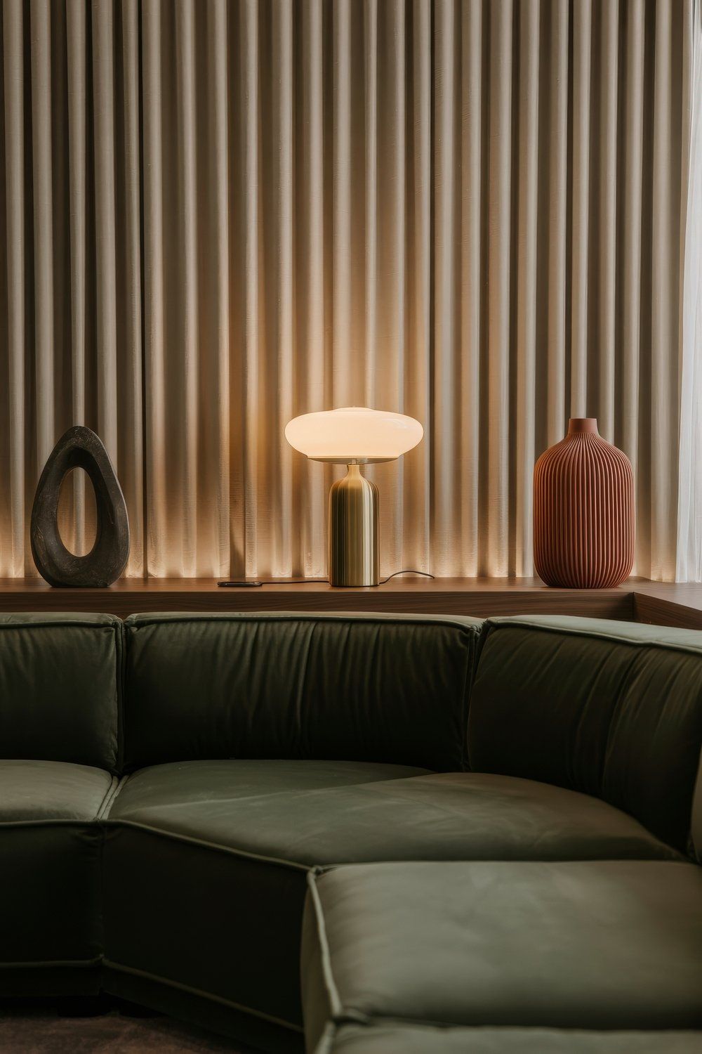 regenerate image of green sofa to match the atmospheric lighting and overall coloring of the reference image the sofa should be a dark navy velvet color