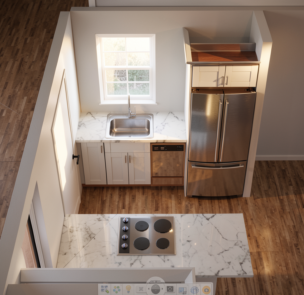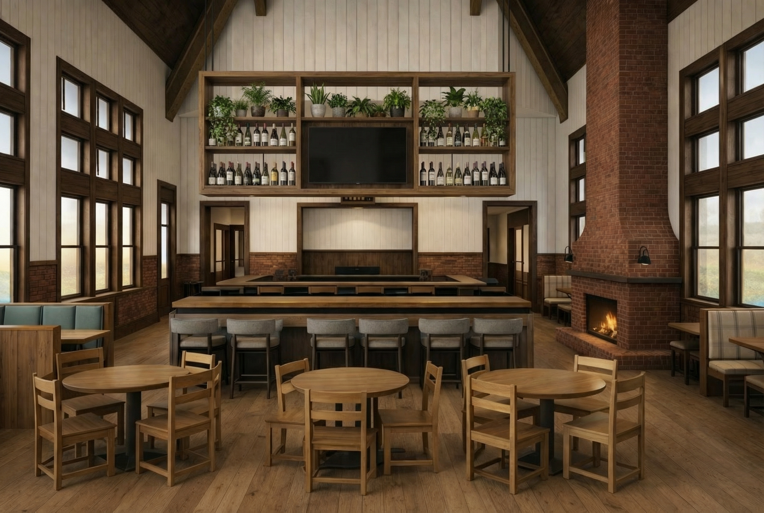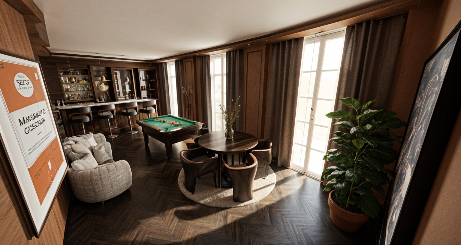 render a modern minimalist bedroom with a warm bright cozy aesthetic the walls are light beige creating a calming atmosphere the bed is a deep brown color with colourful minimalistic bedding offering a contrast against the walls the floor is oak harmonizing the whole room a small desk is adjacent to the bed in oak with a modern minimalistic chair and a computer screen on it large glass doors are across from the bed the overall ambiance is serene and modern add curtains and a lamp at the ceiling