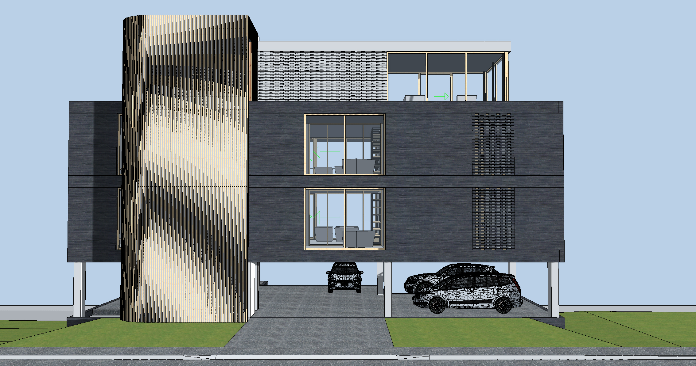 modern house in city houses around dark grey bricks light wood grass and trees around