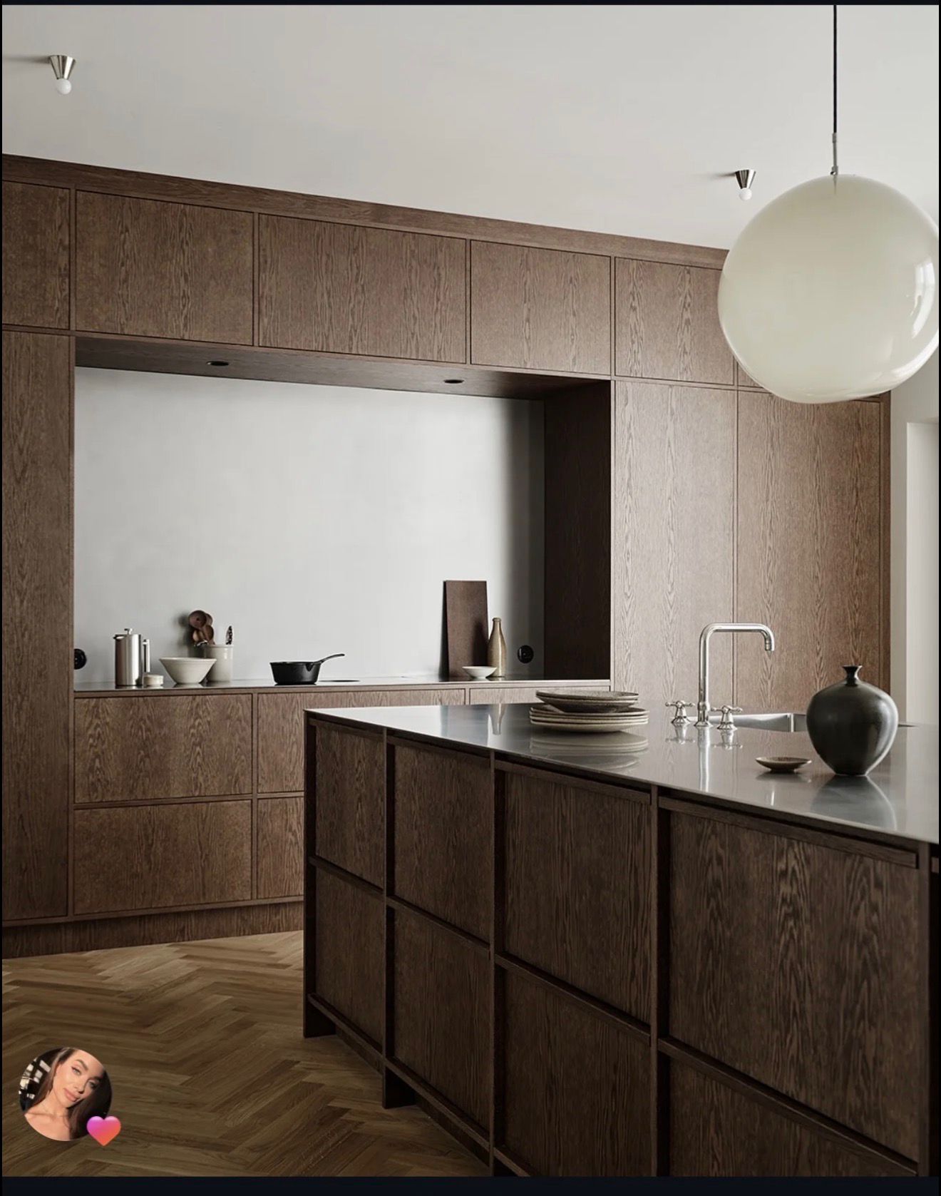 nordic interior shot project context modern open plan penthouse interior kitchen and living room share the same space and read as one architectural composition the living room is positioned in the former dining area the kitchen occupies the designated kitchen zone per plan kitchen design placement built in kitchen fully integrated into the room architecture floor to ceiling cabinetry aligned wall to wall along the long kitchen wall monolithic kitchen island placed centrally parallel to the cabinetry wall island aligned with the structural column maintaining clear circulation minimum 100 110 cm no visible appliances all appliances fully integrated materials finishes cabinetry in dark stained oak veneer matte finish flat panel fronts integrated handles countertops and island top in brushed stainless steel metal matte finish subtle linear brushing soft reflections no gloss integrated stainless steel sink with seamless welded joints flooring in natural wood herringbone pattern walls in warm off white plaster no glossy surfaces living room integration living room seamlessly connected to kitchen low profile modular sofa in light neutral fabric textured area rug defining seating zone minimal stone or metal coffee table lounge chairs in wood and fabric built in shelving in dark wood with subtle indirect lighting calm elegant high end residential atmosphere lighting soft natural daylight entering from large windows even illumination no harsh shadows subtle ceiling spotlights for circulation zones minimal sculptural pendant above kitchen island lighting calibrated for metal surfaces controlled highlights no specular glare realistic global illumination camera composition camera height 1 55 m human eye level 28 35 mm lens straight vertical lines no wide angle distortion primary view toward kitchen island with cabinetry wall visible secondary view from living room toward kitchen showing architectural continuity styling minimal styling only ceramic bowls wooden objects neutral vases no clutter no food no people negative instructions no industrial kitchen style no restaurant kitchen look no futuristic design no curved cabinetry no high gloss metal no exaggerated lighting no oversaturated colors no distorted proportions overall mood warm architectural mediterranean modern penthouse timeless calm refined and realistic architecture