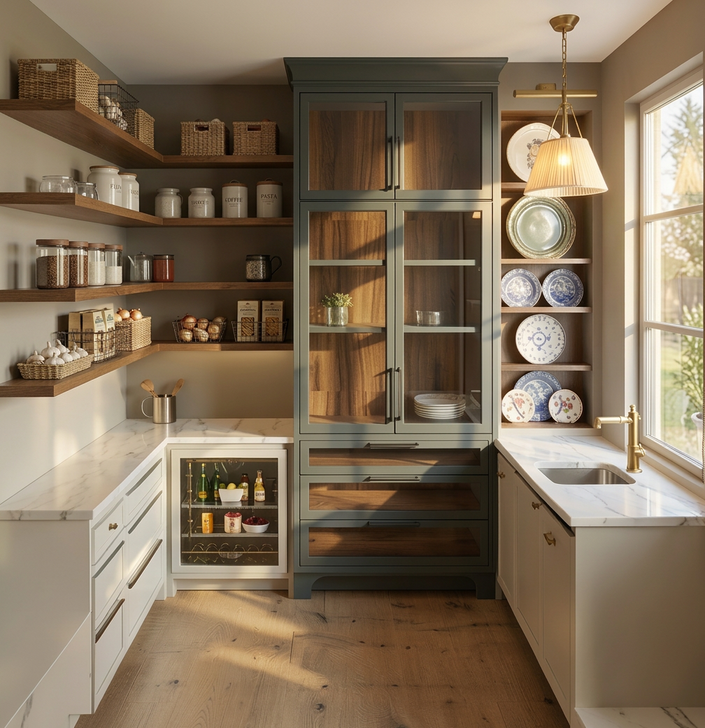 style blue cabinet with glass front with more dishes and lit