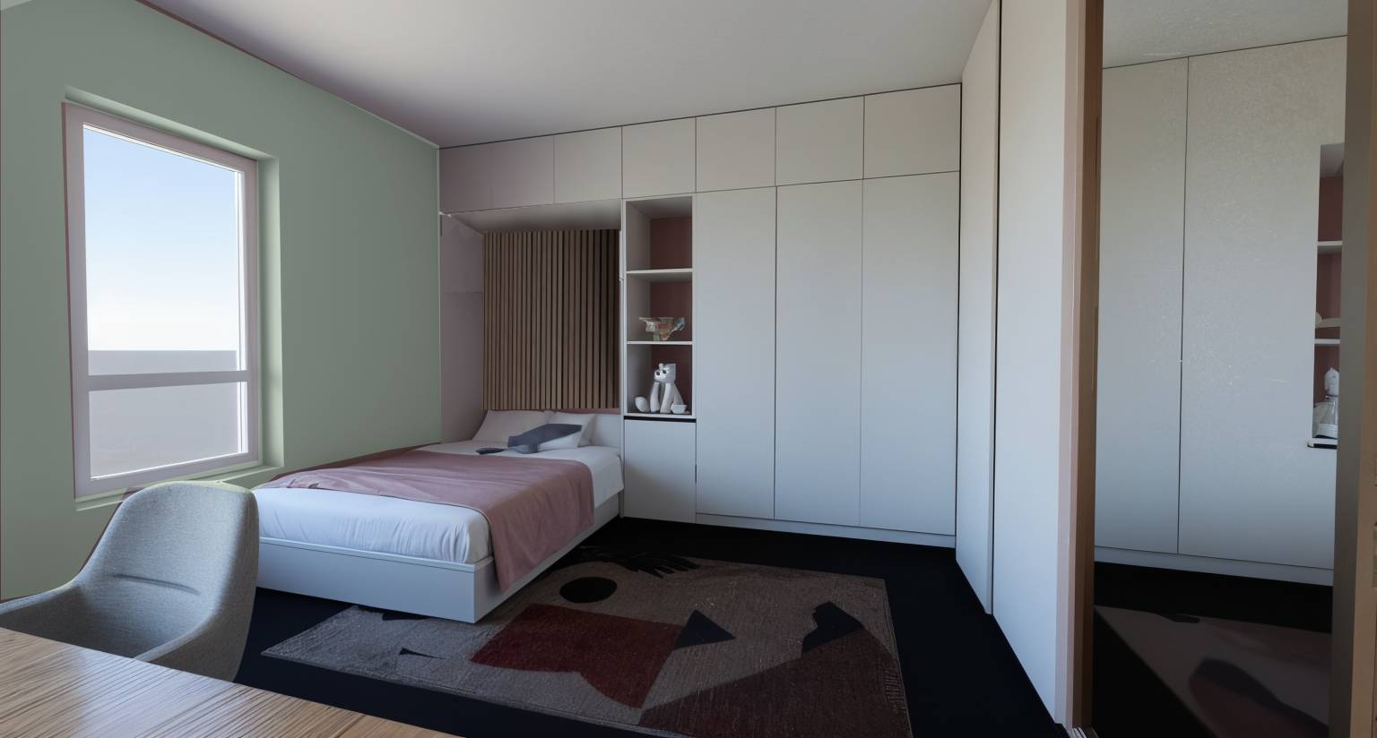 the left wall should be painted in a light green shade similar to sikkens l1 08 86 rgb 217 237 218 the color must start exactly from the corner and cover the entire wall uniformly it should appear fresh natural and softly reflective creating a calm and balanced atmosphere in the room