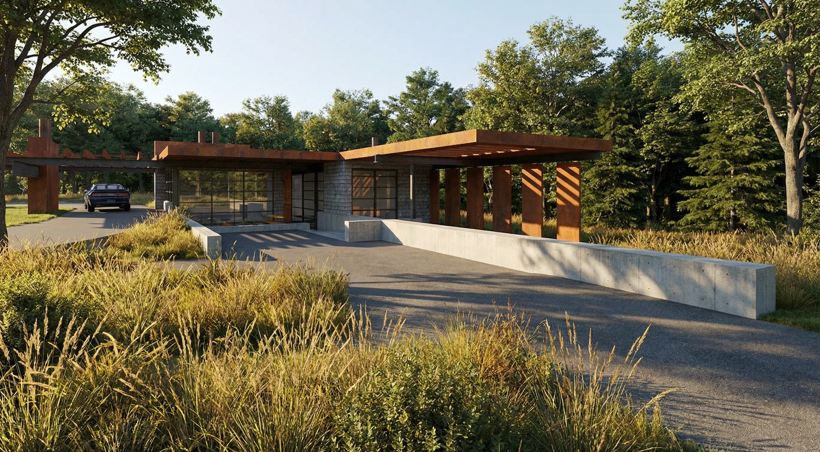 dark weathered shiplap siding corten steel accent walls tall grass foreground fog trees in background sunlight on building face