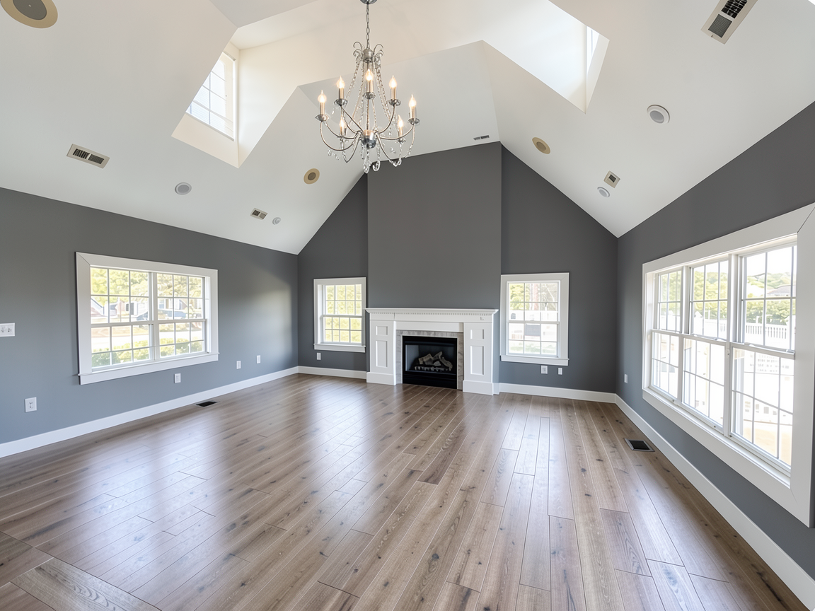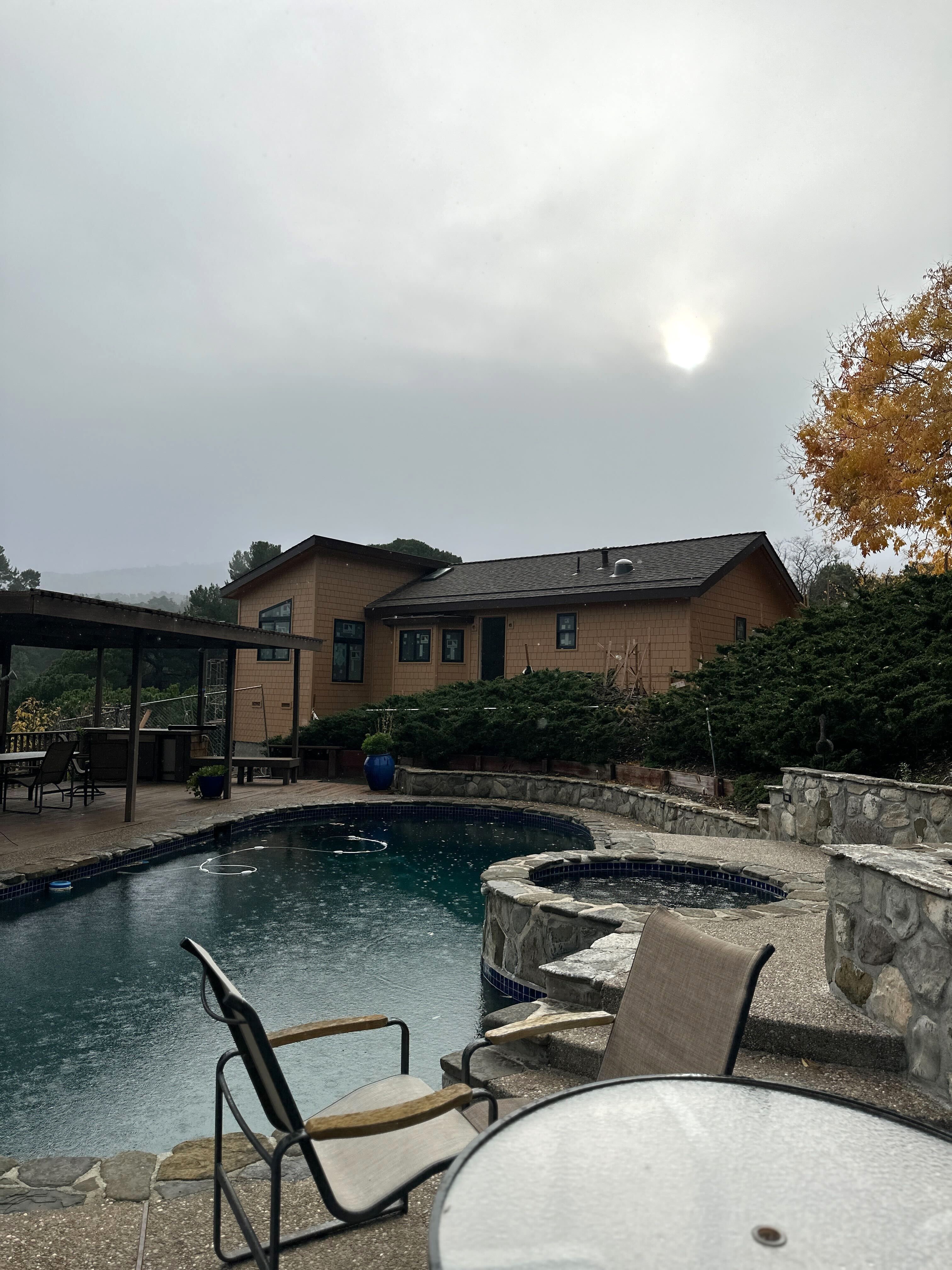 a modern three story house with a sleek design featuring a combination of black and wood textures the surrounding landscape is lush with a variety of large trees with rich green foliage the scene includes a clear bright blue sky with soft fluffy gray clouds the nearby water reflects a vivid turquoise color enhancing the serene and peaceful ambiance the overall atmosphere is calm and inviting perfect for a sunny day in the countryside