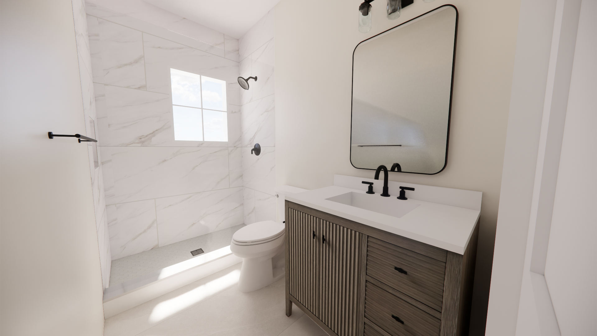 keep everything exactly the same in the rendering do not change the layout walls doors windows shower tile floor tile niche plumbing fixtures mirror vanity lighting materials colors or camera angle only add a glass shower panel door to the shower opening the glass should be clear frameless glass add a black metal shower door with a ladder style handle in matte black the handle should be vertical and mounted on the glass panel do not change the showerhead valve window tile or curb do not change the vanity mirror or lighting do not change any materials or colors do not move anything the only change should be adding the glass shower panel door with black hardware and a ladder handle make the final image look like a realistic photo rendering with natural lighting and soft shadows the rendering should look like a real photograph not a stylized render