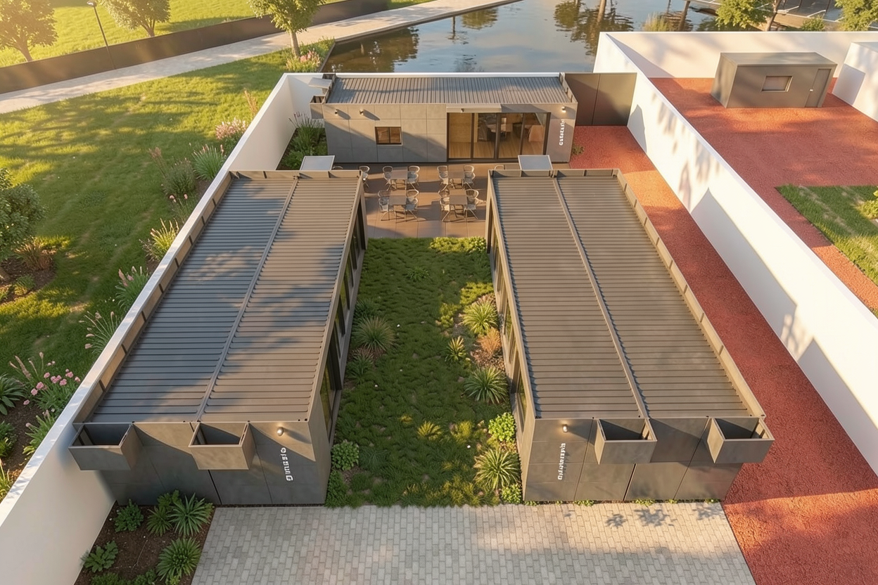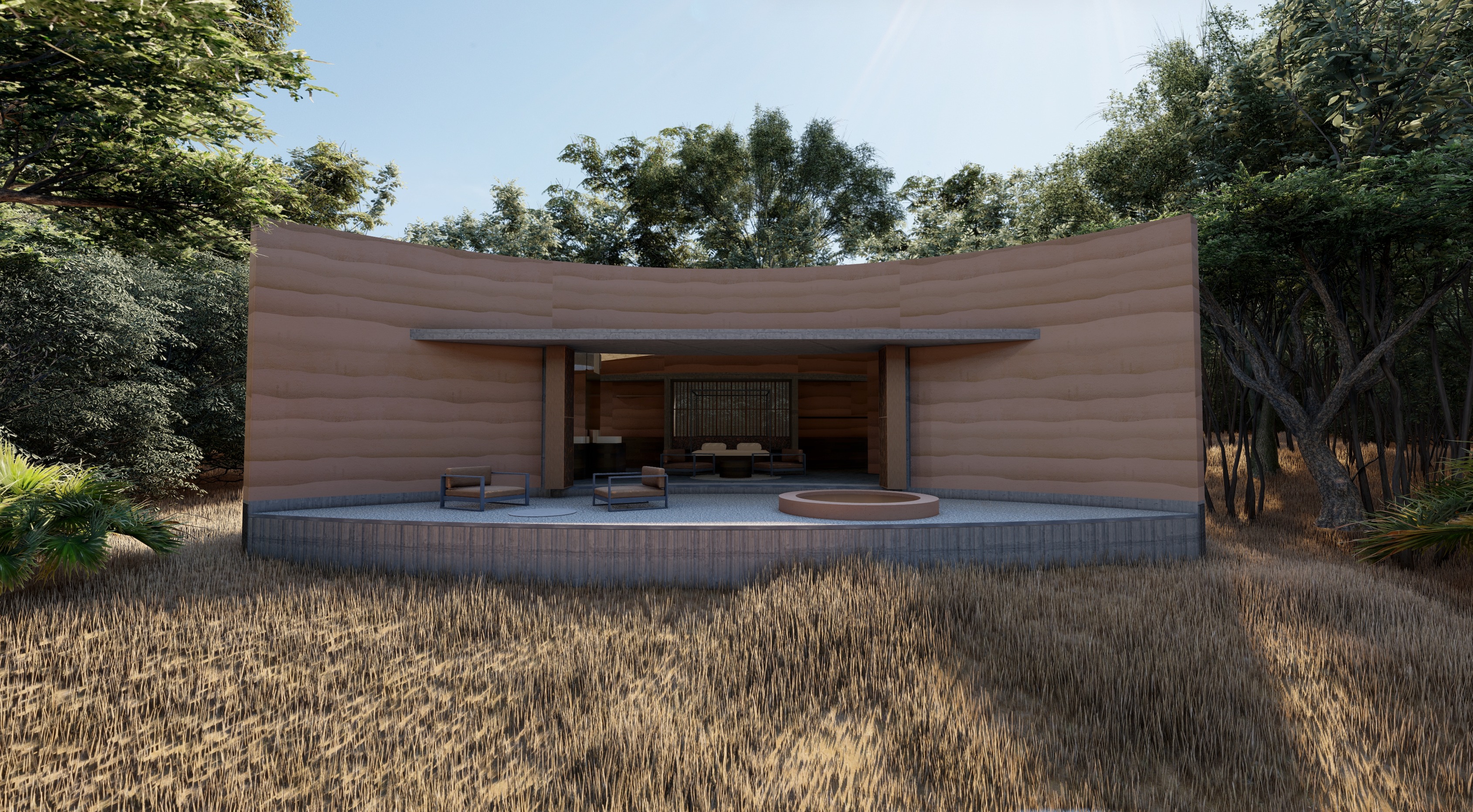 a serene outdoor scene featuring a unique cylindrical structure with a warm beige earthy texture surrounded by a circular stone wall in the foreground lush green grass with hints of beige and purple in the background a tranquil river meanders amidst dense greenery with varied shades of green the sky is a bright clear blue with soft fluffy white clouds creating a peaceful and inviting atmosphere