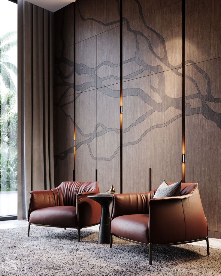 executive office with large windows and wallpaneling throughout timber panels with decorative tree branches motive gark oak herringbone floorimg lush garden outside office architecture