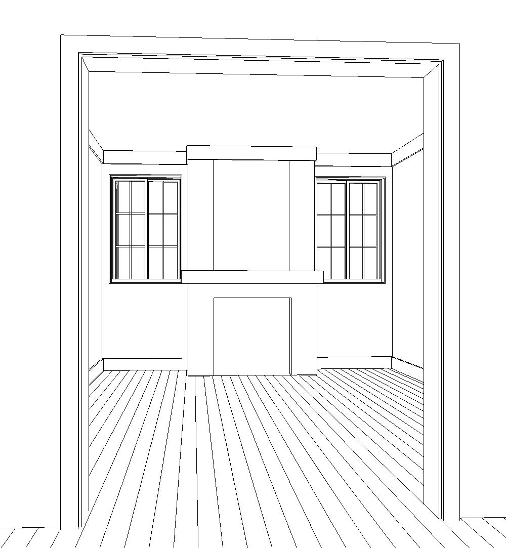 interior elevation of a traditional farmhouse style fireplace with stacked arizona stone rustic barn wood beam lintel dunn edwards cool december white painted walls white painted crown and base molding walnut wood plank flooring abundant natural light entering through the windows with white window frames green vegetation outside no furniture